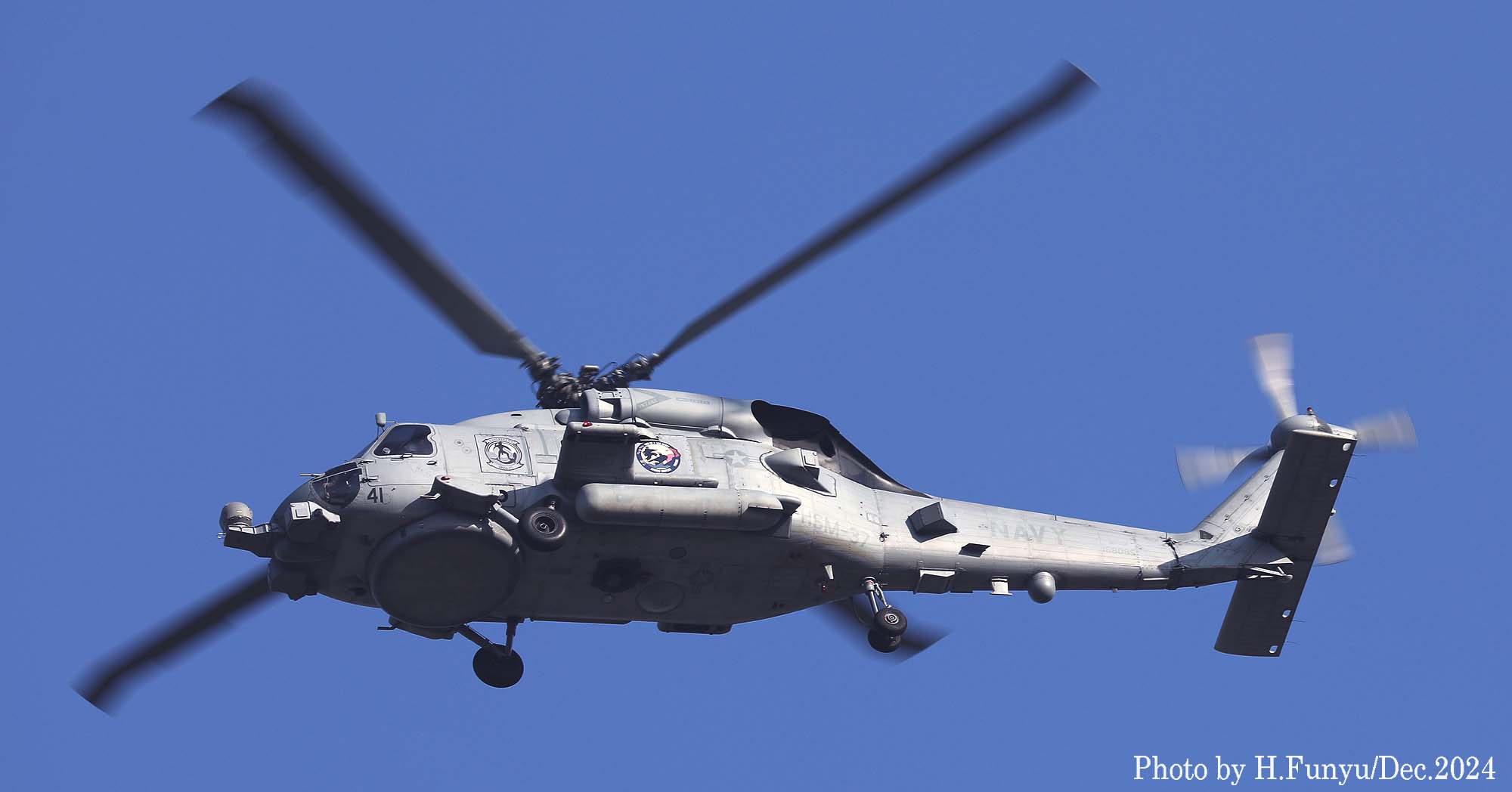 ↑ フニュ師匠が撮影したHSM-37のMH-60R/Bu.No.168085。昨年も厚木基地に飛来しているが、左側面にカラーでマークが新たに書き込まれている。