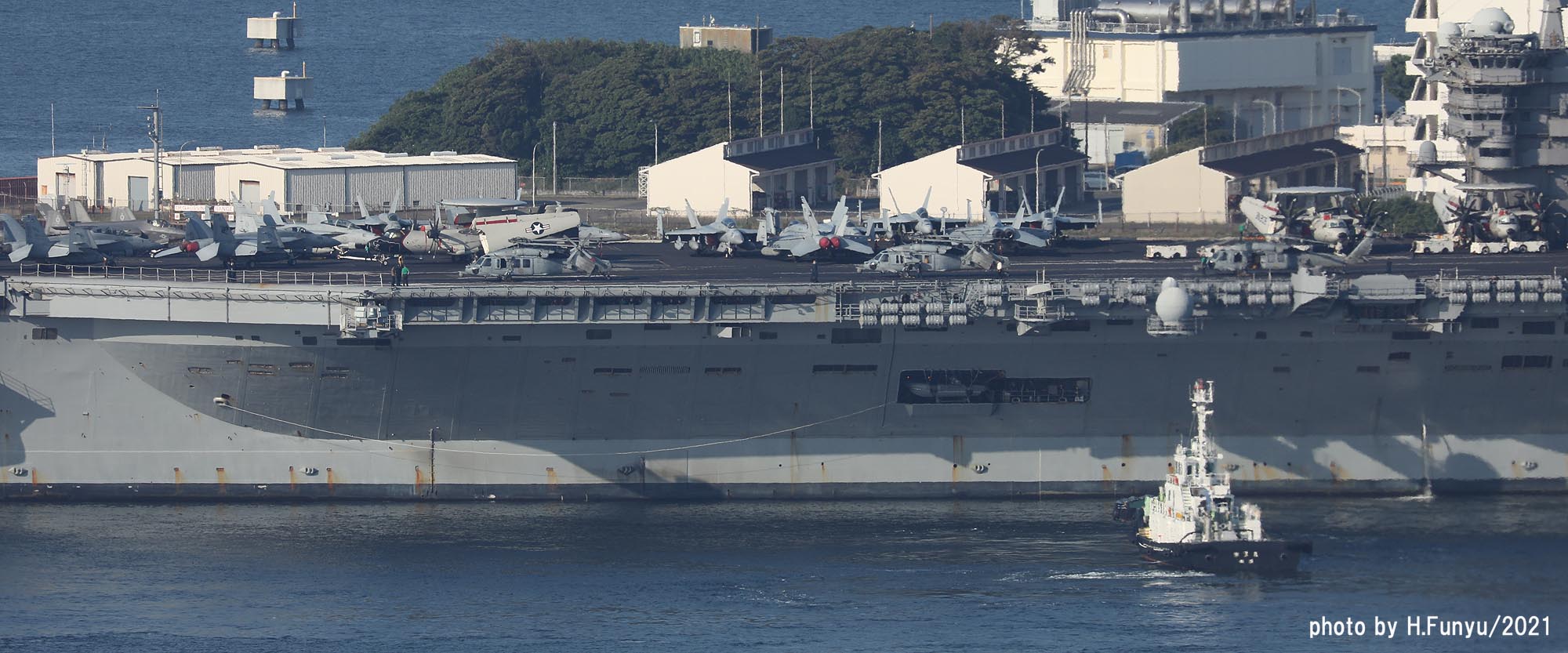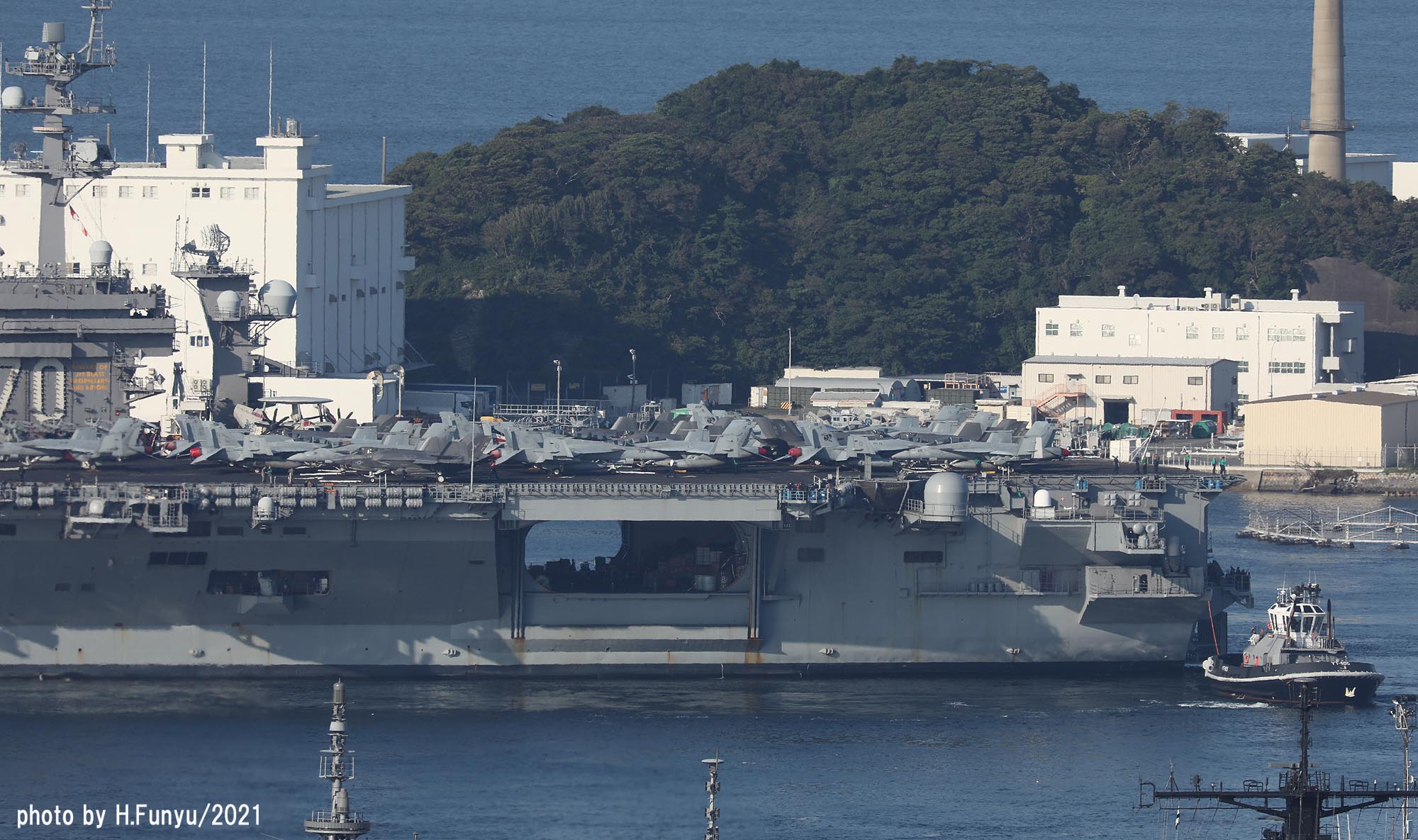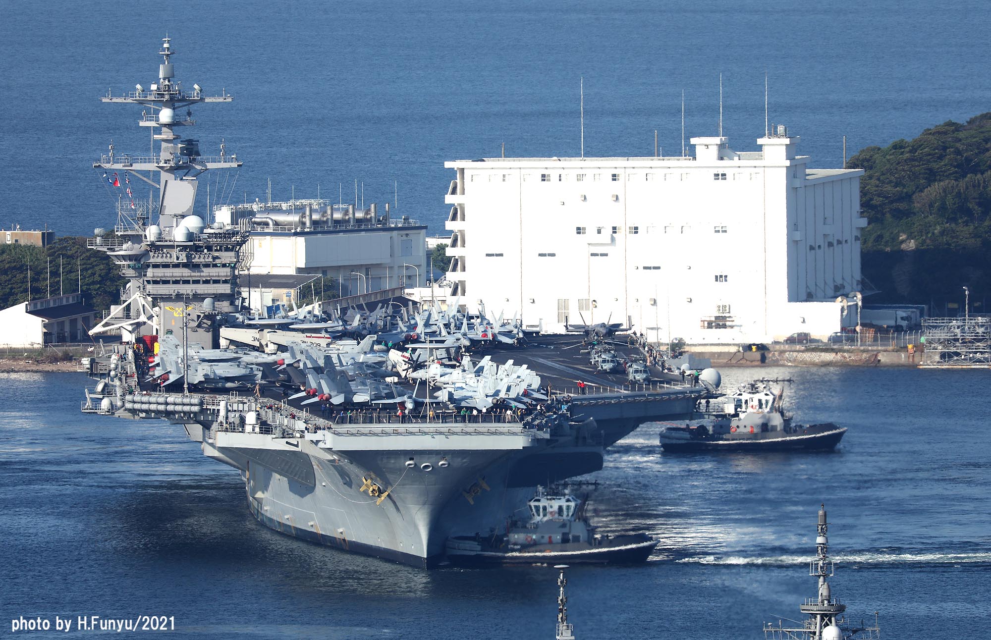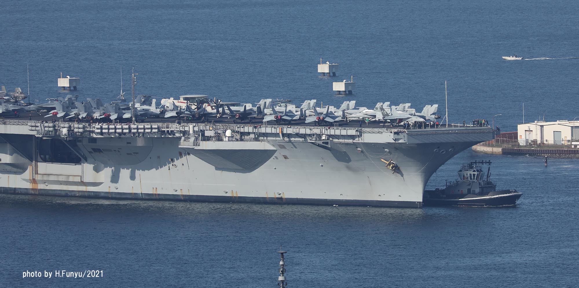 2隻のタグボートが、入港を支援しているが、空母の回頭では、艦首側一隻の力で充分な様子で、最近のタグボートは相当な力持ちである。甲板は、FA-18E/F/G系の機体であふれており、形が異なる機種は、E-2DとMH-60ぐらいで、昔のように5種~6種もの多彩な機体を積んでいた時代よりも運用効率は相当向上しているはずである。