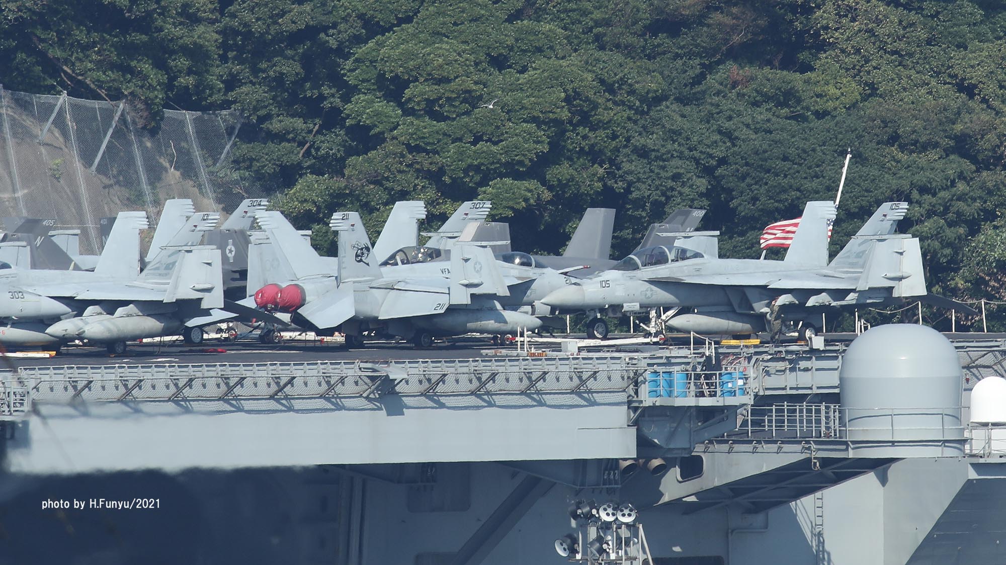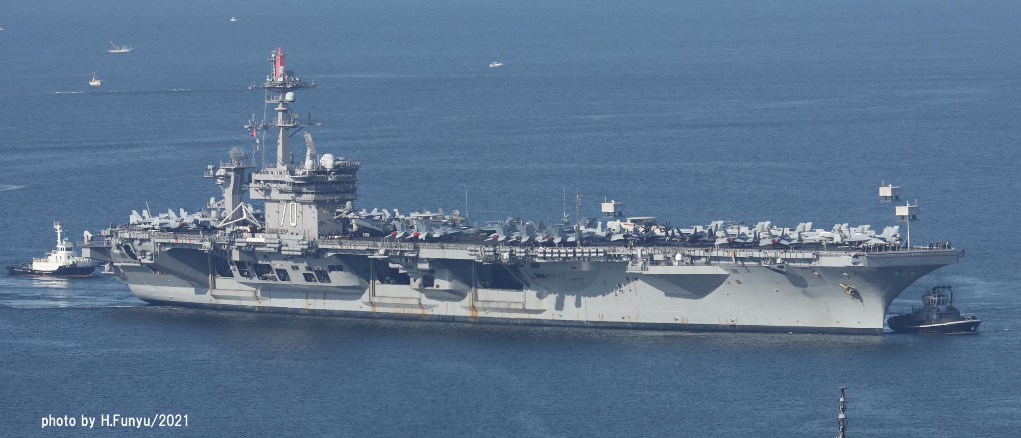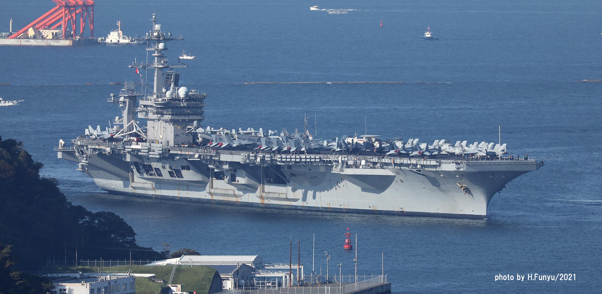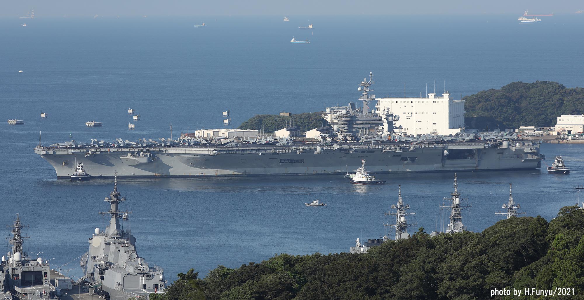 2隻のタグボートが、入港を支援しているが、空母の回頭では、艦首側一隻の力で充分な様子で、最近のタグボートは相当な力持ちである。甲板は、FA-18E/F/G系の機体であふれており、形が異なる機種は、E-2DとMH-60ぐらいで、昔のように5種~6種もの多彩な機体を積んでいた時代よりも運用効率は相当向上しているはずである。