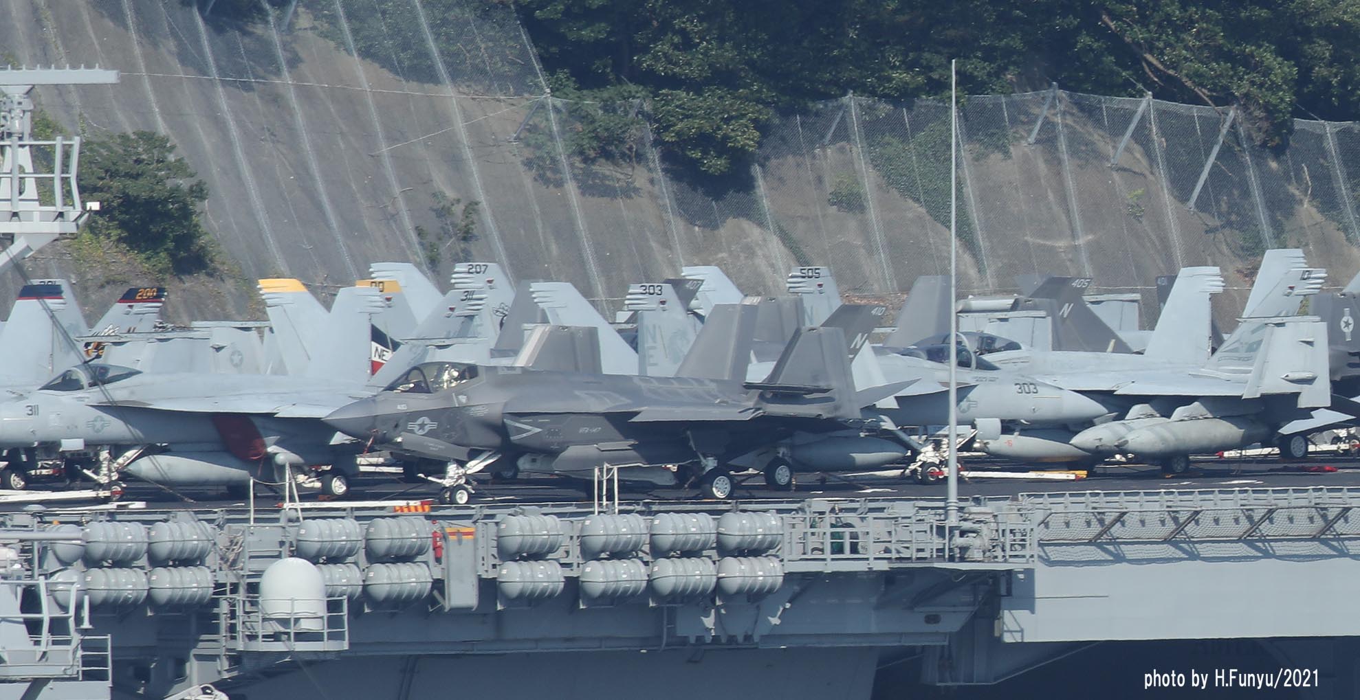 艦首のデッキ上には、元CVW-5にも居たVFA-195 ゴールデンドラゴンズの300番機が見えるが、ブラックテールとなっているようだ。今回、話題となったのは、F-35Cが配備されたVFA-147が搭載されていることとCVM-22オスプレイを装備したことで 写真でも2機のF-35C後姿が見える。意外と機体は大きい。