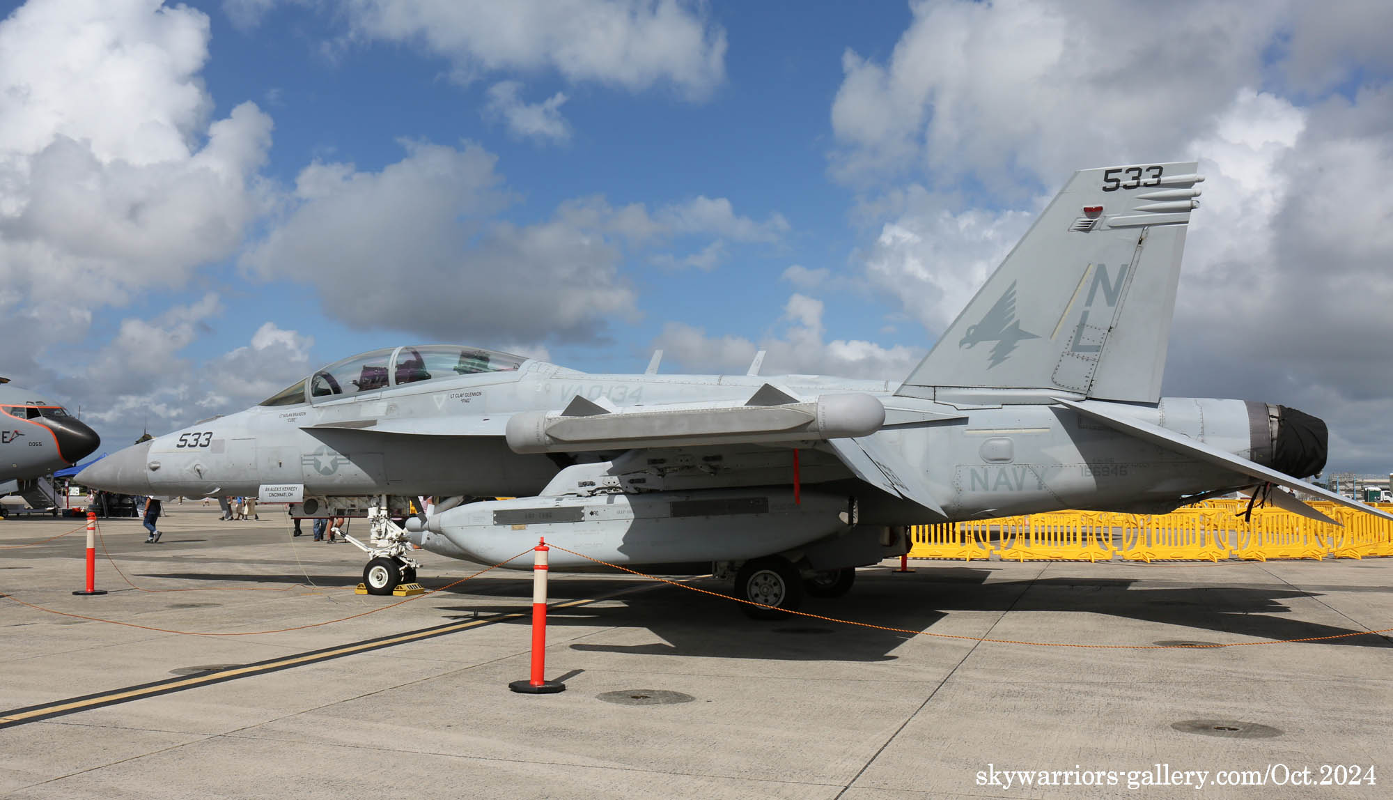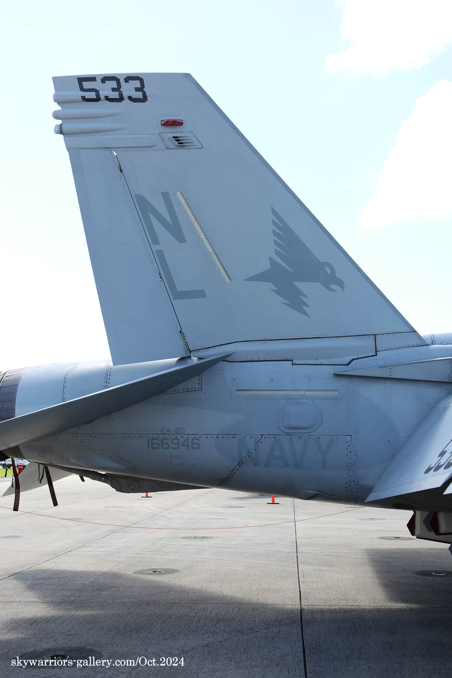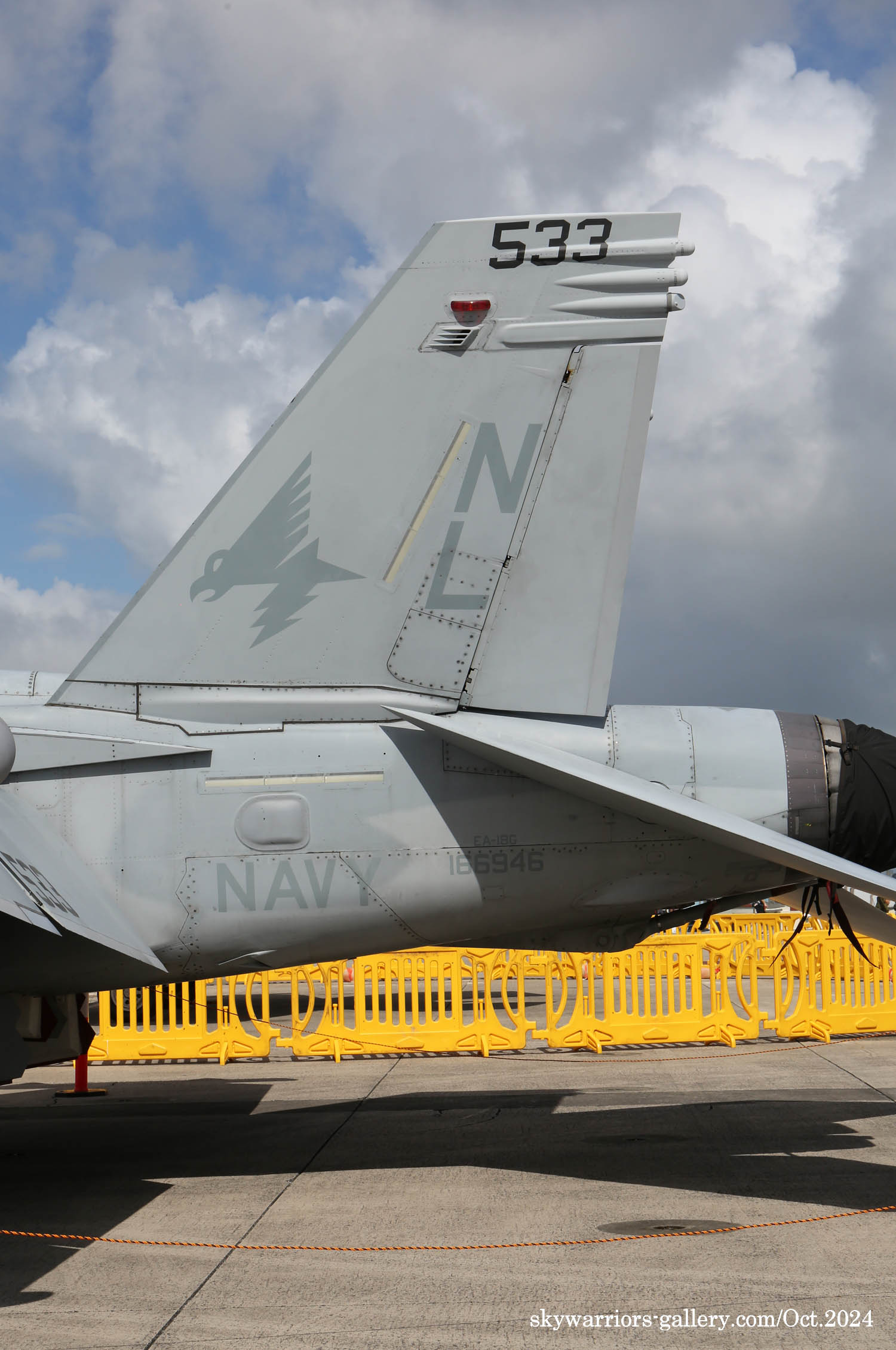 ↑ 2024年10月6日普天間基地で撮影したVAQ-134EA-18G/NL-533/Bu.No.166946。翌日 嘉手納基地での情報では彼らは嘉手納に来て1か月近いがあまり活発に飛行していないようである。特に色付のNL-530は1度しか飛行していないと、地元のマニアが嘆いていた。また調子が悪いのか・・・