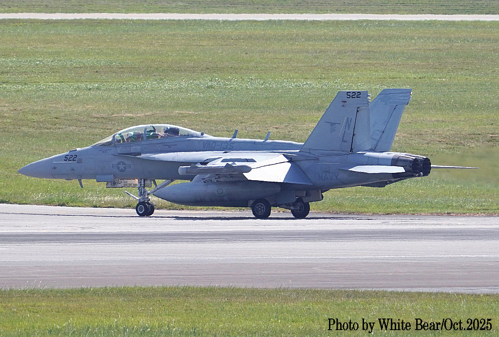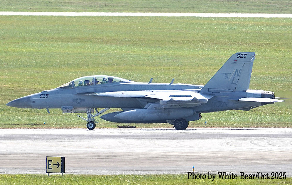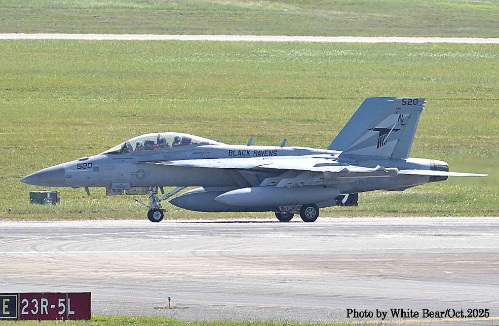 前回VAQ-135の飛来は2023年4月であったが、それから2年半経過した2025年10月再び彼らは日本の地に降り立った。VAQ-209の後任として2025年秋には交代部隊が来ることは予想された事であったが、10月7日まではVAQ-209はまだ嘉手納にいたのである。最近は数日から1週間ほど、嘉手納基地でオーバーラップさせて、任務の引継ぎをするようである。今回、私は彼らの飛来直前に嘉手納を離れたが、White Bearさんが入れ替わりで嘉手納展開されたため、White Bearから送って頂いた到着時の写真から展示させて頂く。(2025年10月 記)