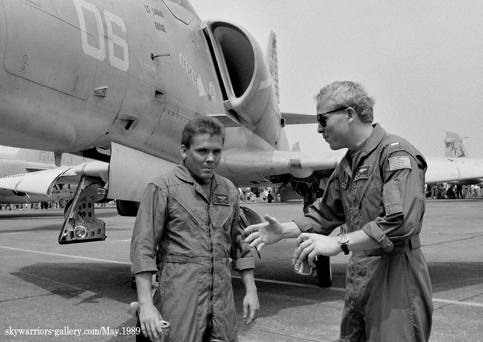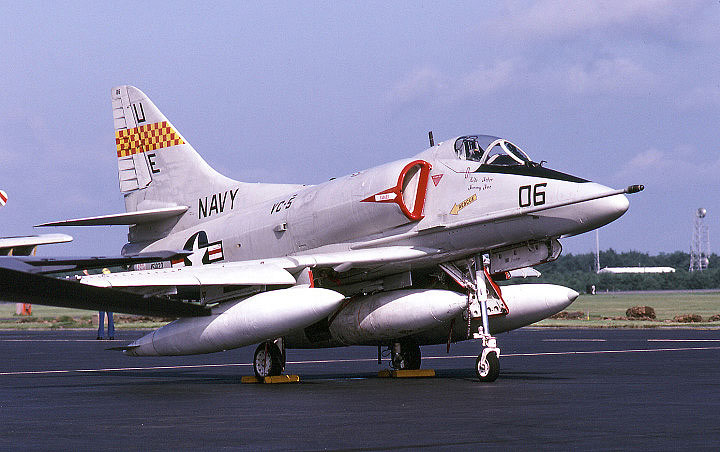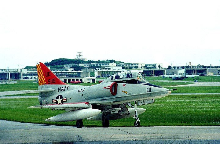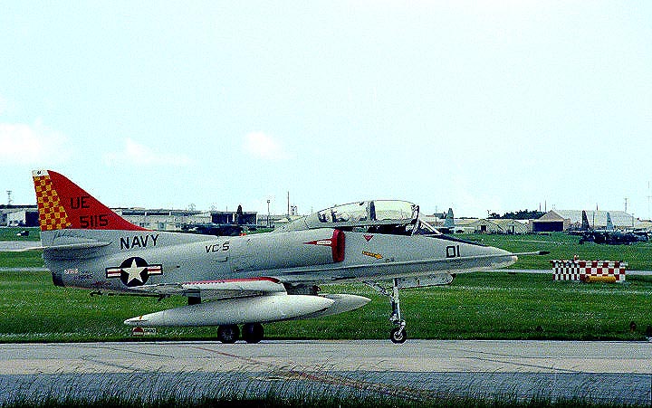 厚木基地に写真撮影で通い始めた頃、この部隊のTA-4Jが撮れれば、その日は他に何も撮れなくても満足して家路に家路に着く事が出来た。それほど私にとっては貴重な存在だったVC-5だが、それは機体を彩る赤黄のチェッカー模様が実に美しかったからである。これらの機体をもっと撮りたいと嘉手納基地まで遠征した(もちろん、VC-5だけが目的ではなかったが大きな目的の1つではあった)。”VC”とは艦隊飛行隊のことを差し、部隊の主な任務は艦船と航空機に対する射撃訓練の支援である。その為、標的を曳航することは彼らの任務の一つであり、味方からの誤射を避けるために尾翼に目立つ赤黄のチェッカーを描いた。この美しい機体がマニアにとっては、格好の被写体であったのだ。私は撮った事がないが、機体を純白に塗りこめたTA-4J(UE-01/155115)などは写真を見るだけでしびれた。その後この部隊はマーキングを度々変更するが、最後は標的曳航の任務から解放されたのか、お定まりのロービジとなった。