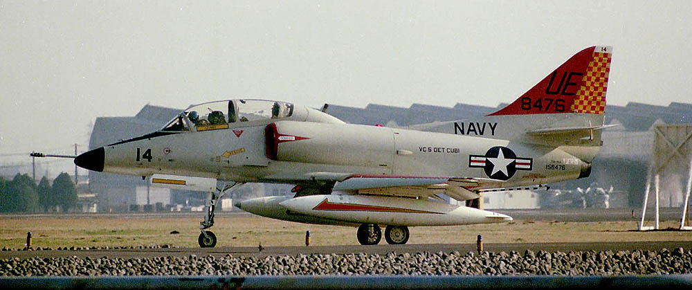 1976年 厚木基地に通い始めて初めて撮ったVC-5の機体が、この”UE-14"。鼻黒のTA-4Jである。この日は、この他にUE-05/UE-01がR/W01で離陸していった。胴体に”VC-5 DET CUBI"の文字、この頃はフィリピンのキュービー・ポイント海軍基地が彼らの本拠地であった。