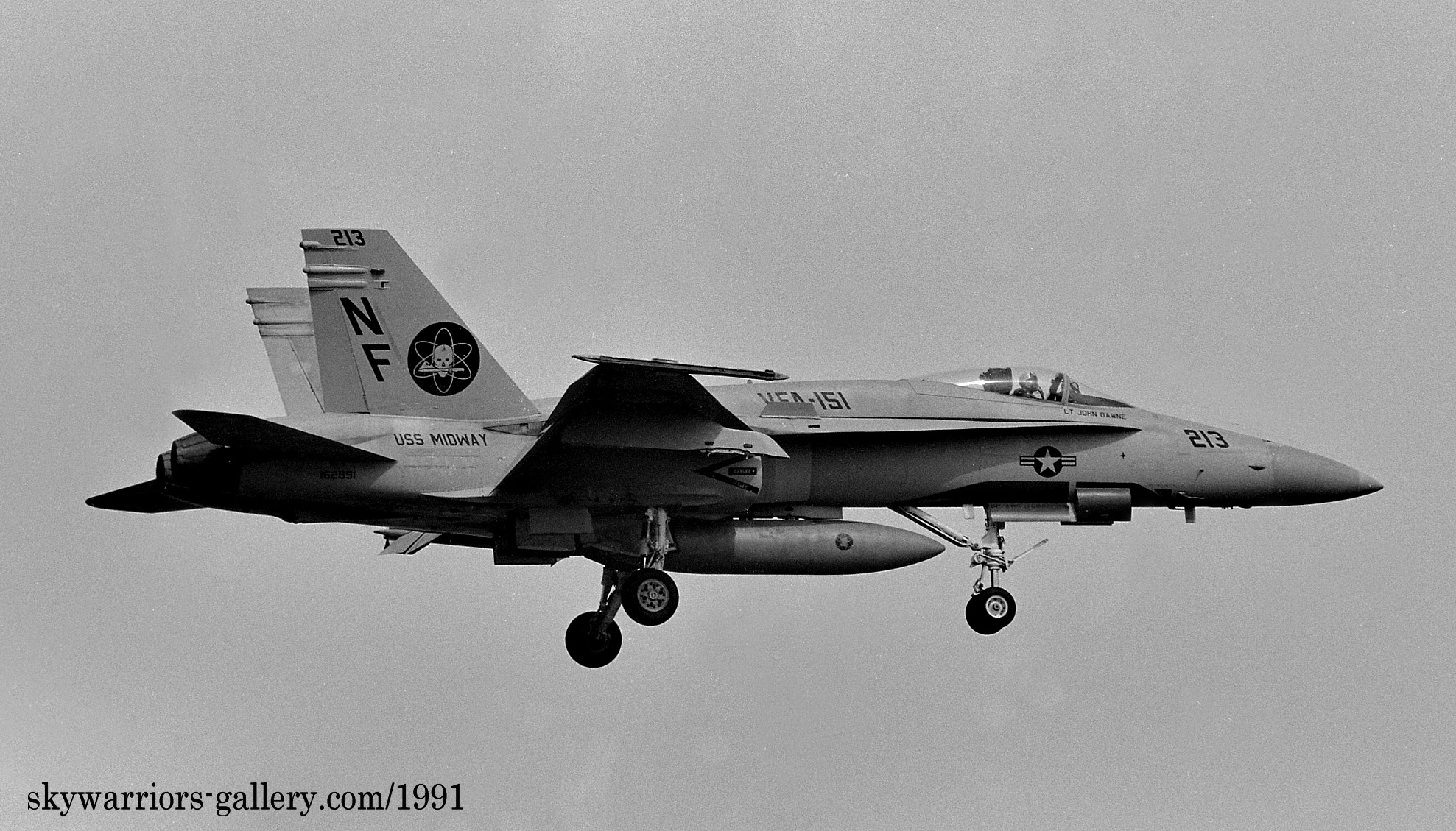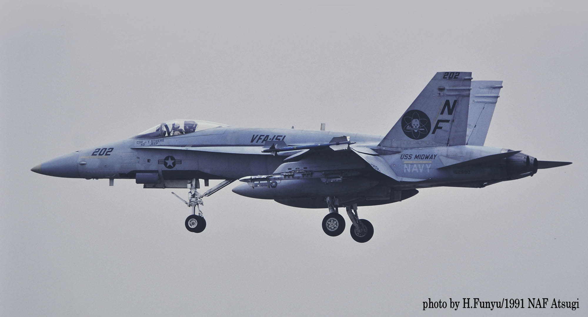↑ フニュ君が厚木基地で撮影した母艦インディペンデント入港時にフライインするVFA-151のFA-18A各機。ラックには母艦から持ち帰った兵装などが付いている。