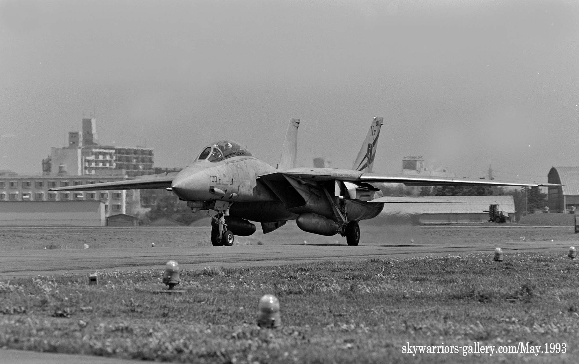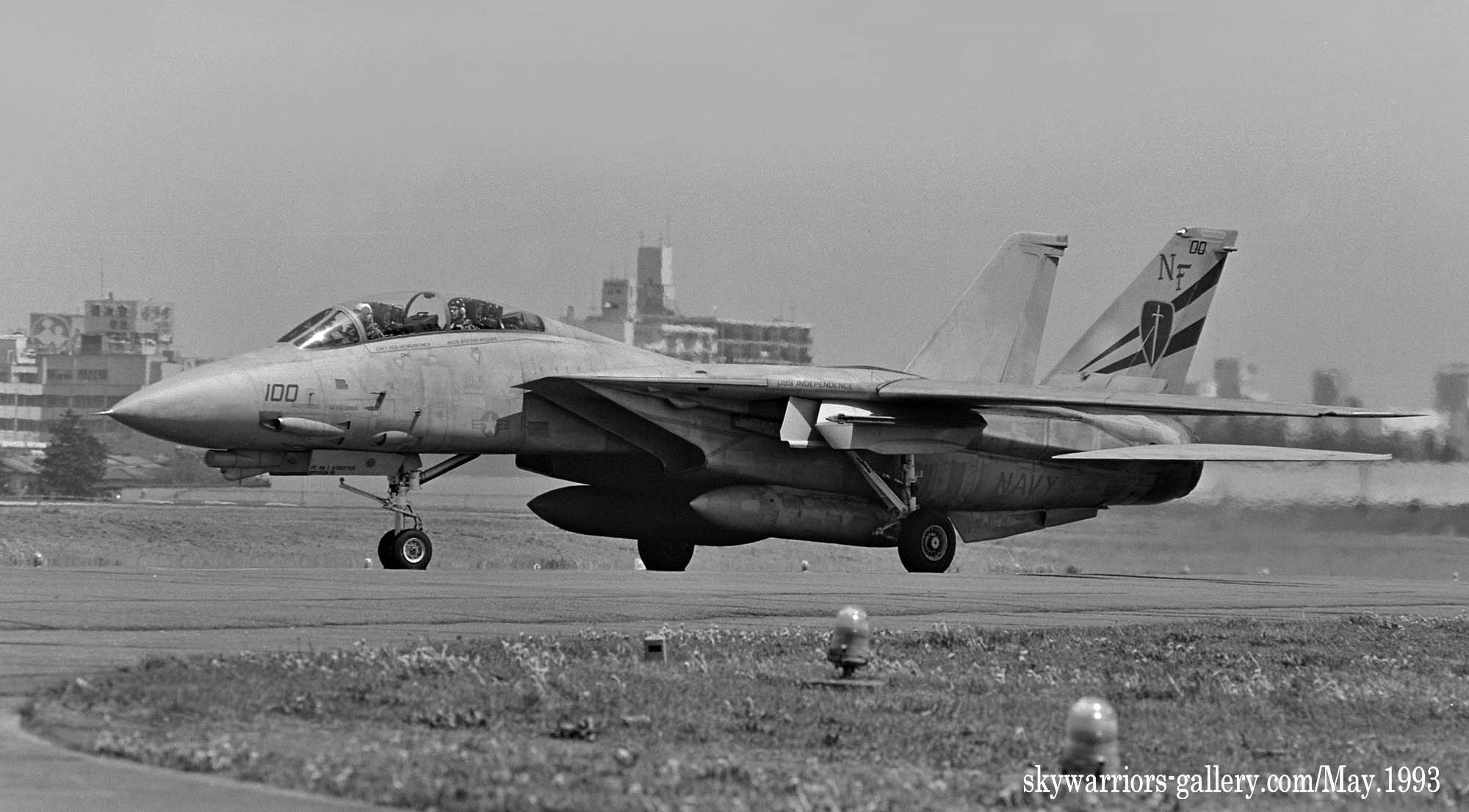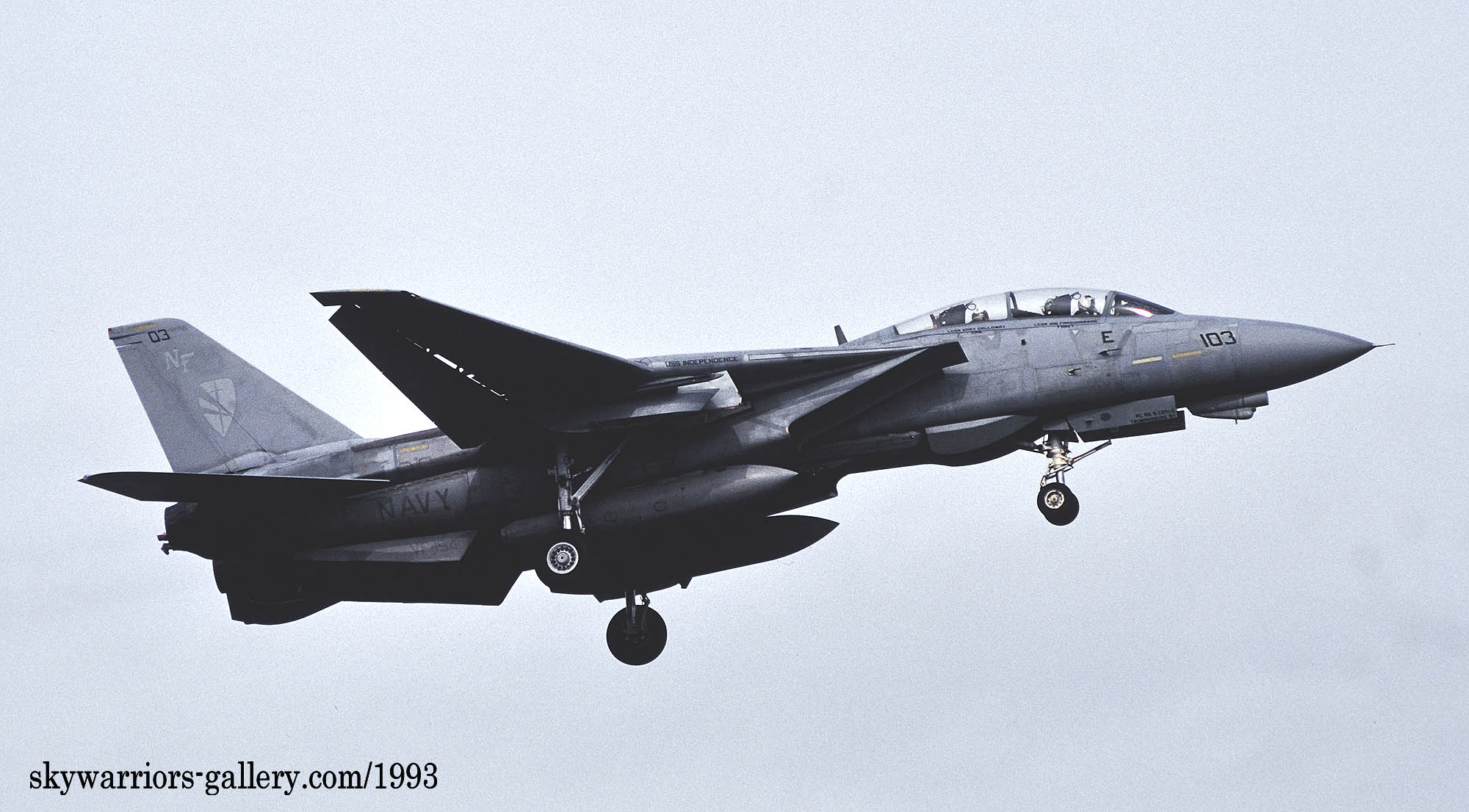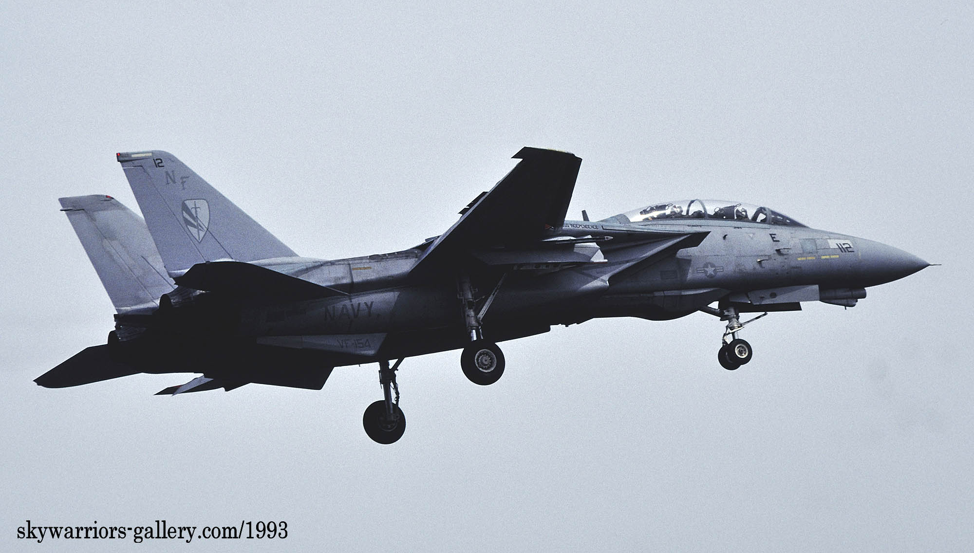↑ 厚木基地でローカルフライト訓練するVF-154のF-14A/NF-102。1993年がこの地味な尾翼のマーキングの見納めとなった。