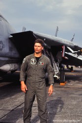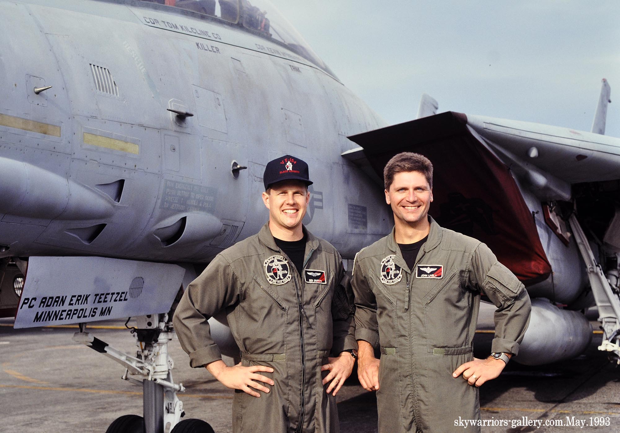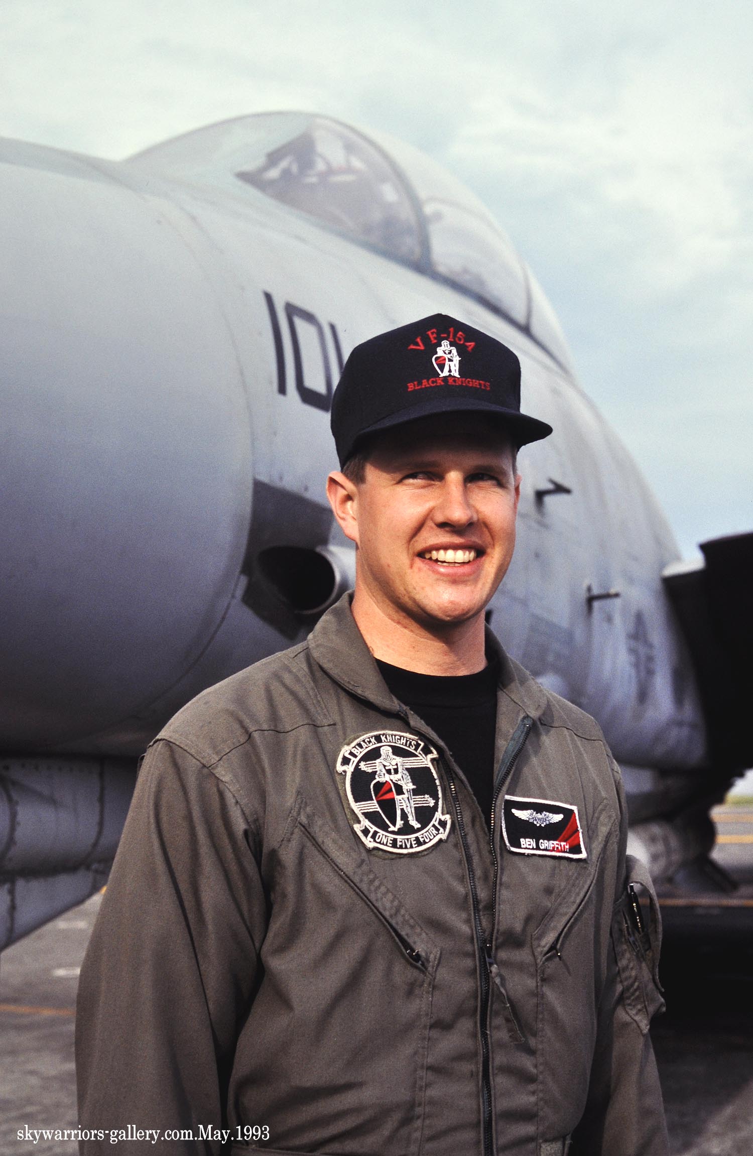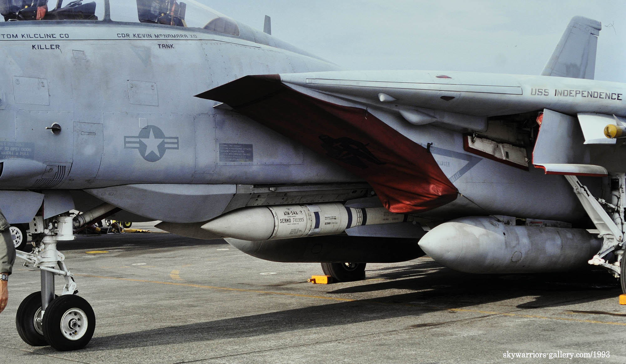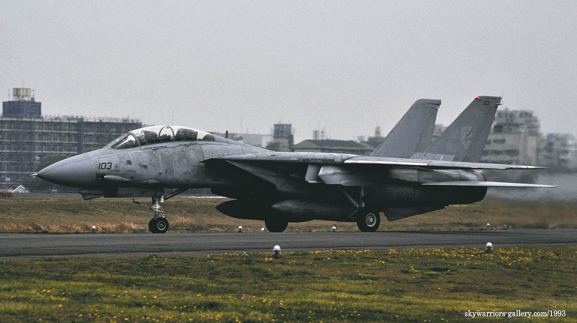 ↑ 厚木基地でローカルフライト訓練するVF-154のF-14A/NF-102。1993年がこの地味な尾翼のマーキングの見納めとなった。