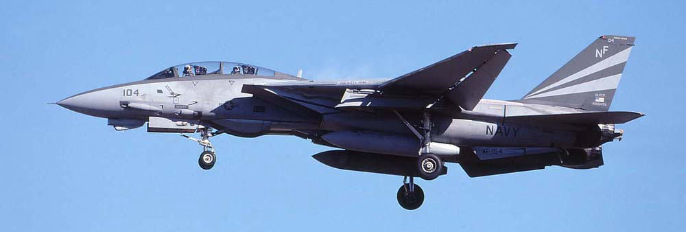 ↑ 左翼にフェニックスミサイルのイナート弾をぶら下げて厚木で訓練中のNF-110。このマーキングは2001年11月頃から見かけられ 2002年にはほぼ全機に施された。1996年に対地攻撃用の改装が行われている為 純粋な邀撃戦闘機ではなく すでに戦闘攻撃機としての役割が大きいトムキャットであった。