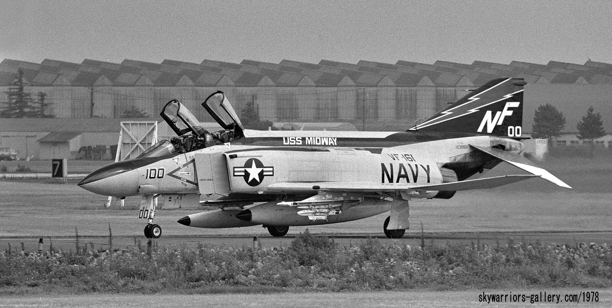 ↑ 厚木基地のR/W19で離陸の為滑走路へ向かうVF-161/NF-100。J型に交換された後の100番は、特にCAG機としての特別なマーキングも施されず、NF-200番機とのマーキングの格差は大きくなり注目を受ける事もなかった。