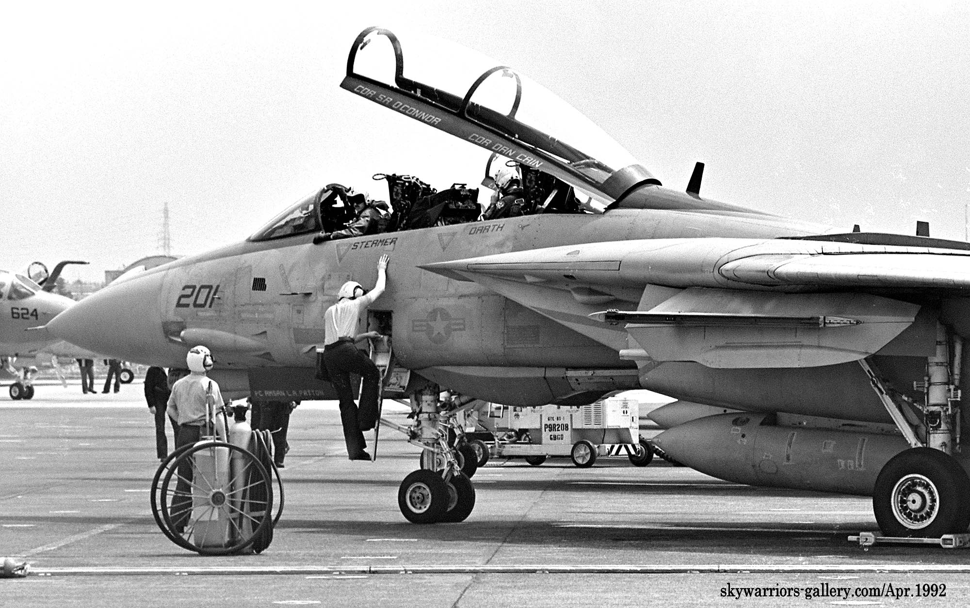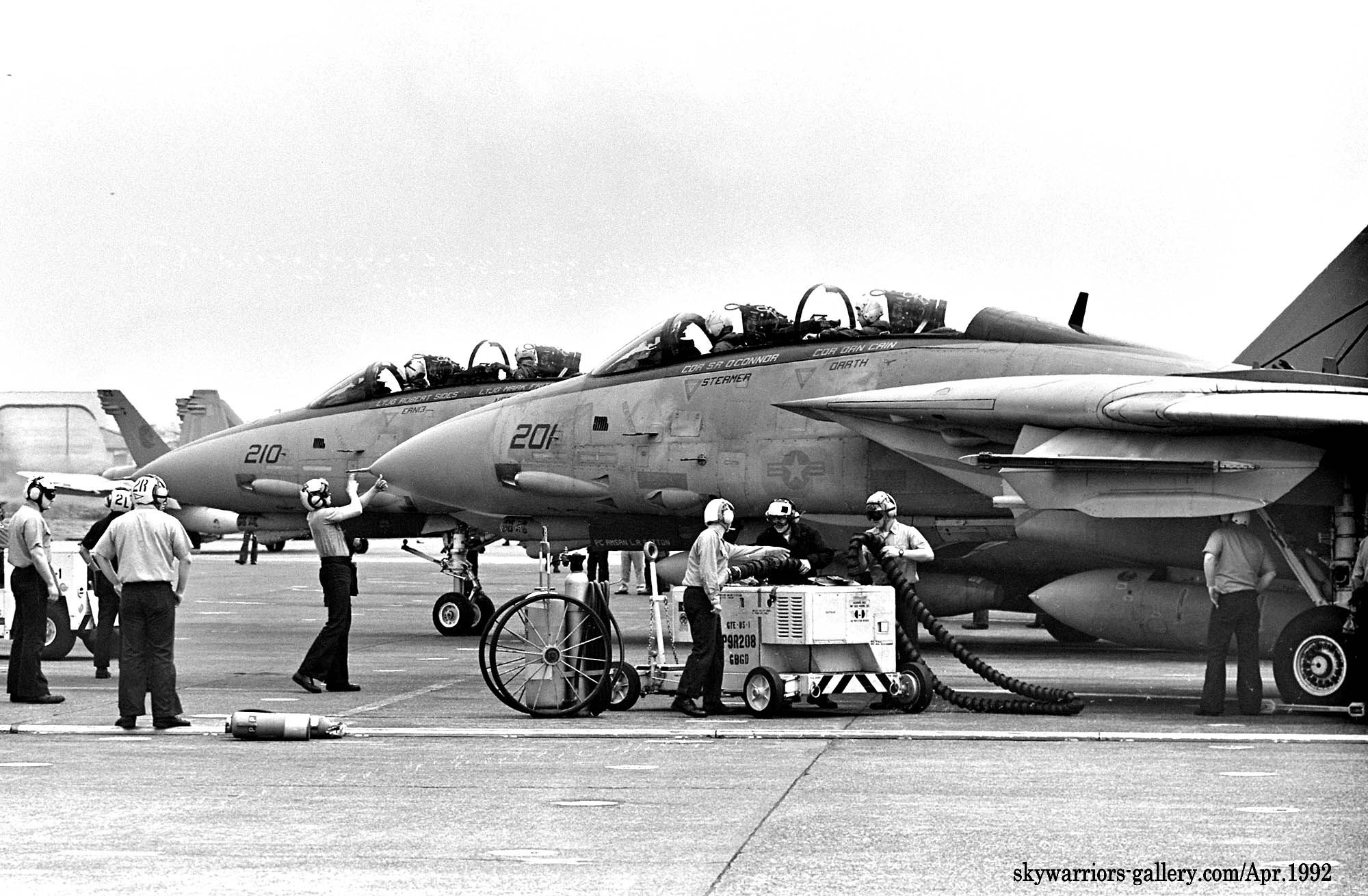 ↑ 確か金網越しに撮影したと思うが、VF-21のF-14Aのエンジン始動前準備風景から、始動⇒タキシングに至るまでの一連のシーンを間近に見る事が出来たのは幸運だった。私は、興奮しながら完全に自分自身の世界に浸って、一連のクルーの動きをファインダーに収めた。機首下面のカメラ筒に”闘魂”と書かれている。