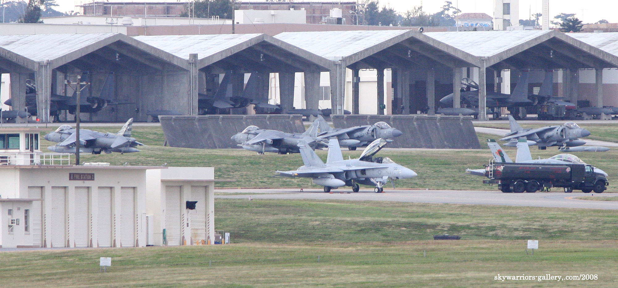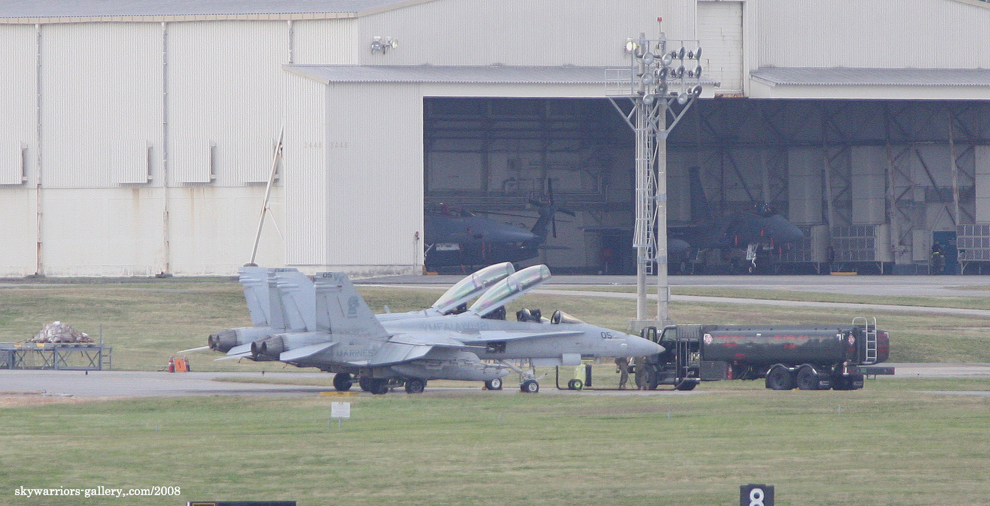 前の週はバンバン飛んだらしいのに・・・2008年12月15日の週は機体の調子が悪いのか、給油はしてもコックピットは閉めたまま。尾翼のグリーンナイトが寂しく写った。バックに並ぶのはこれまた今回1機も撮れなかったVMA-223のレーダーハリアー。運が無い時はいつもこう言うものである。2008年12月15日撮影