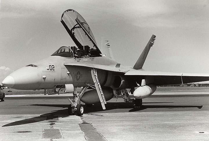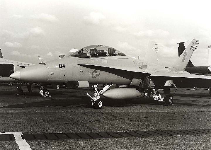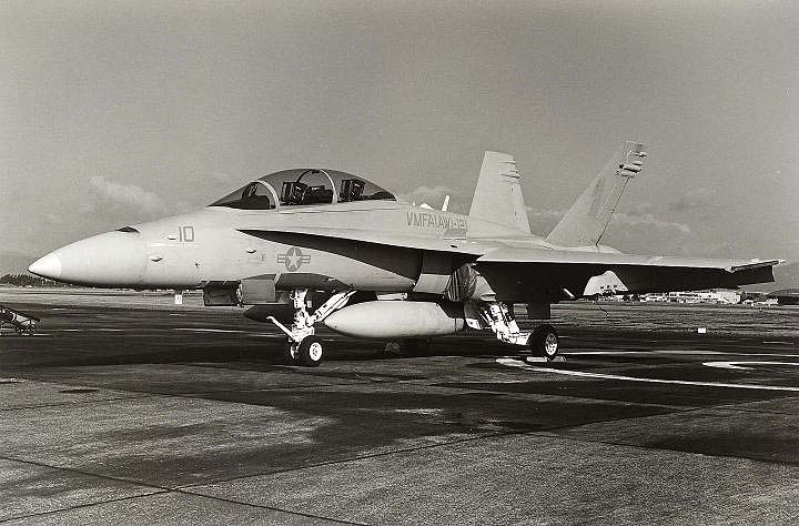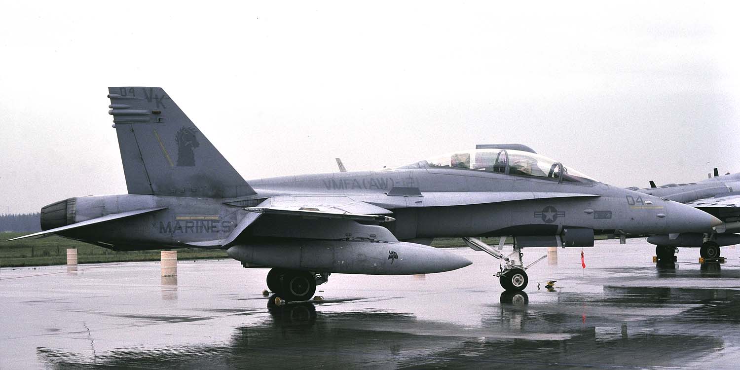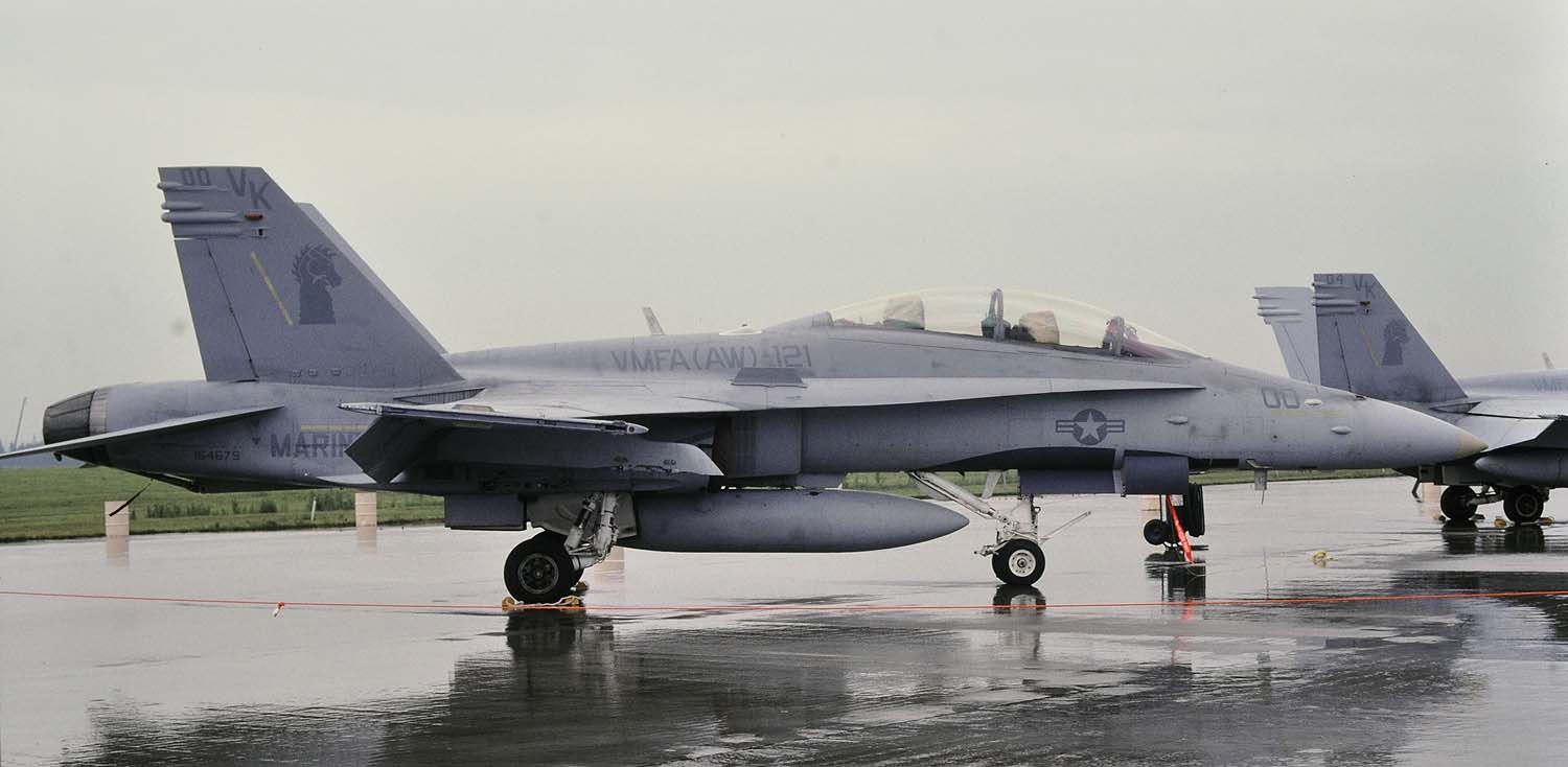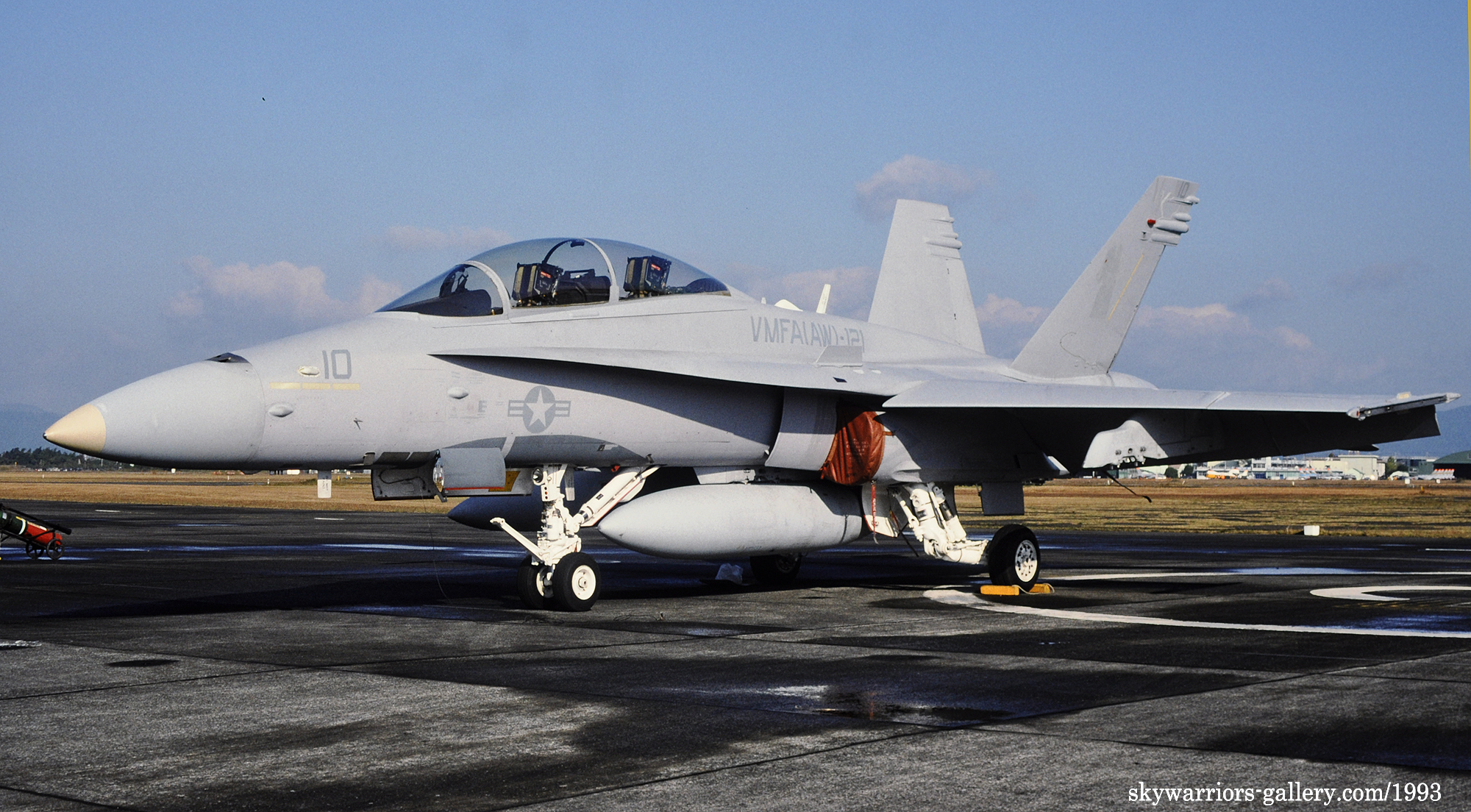 ↑1993年浜松基地に展示されたVMFA(AW)-121のFA-18D/VK-10 尾翼のナイツは、極めて薄く書かれておりロービジのお手本のような機体。