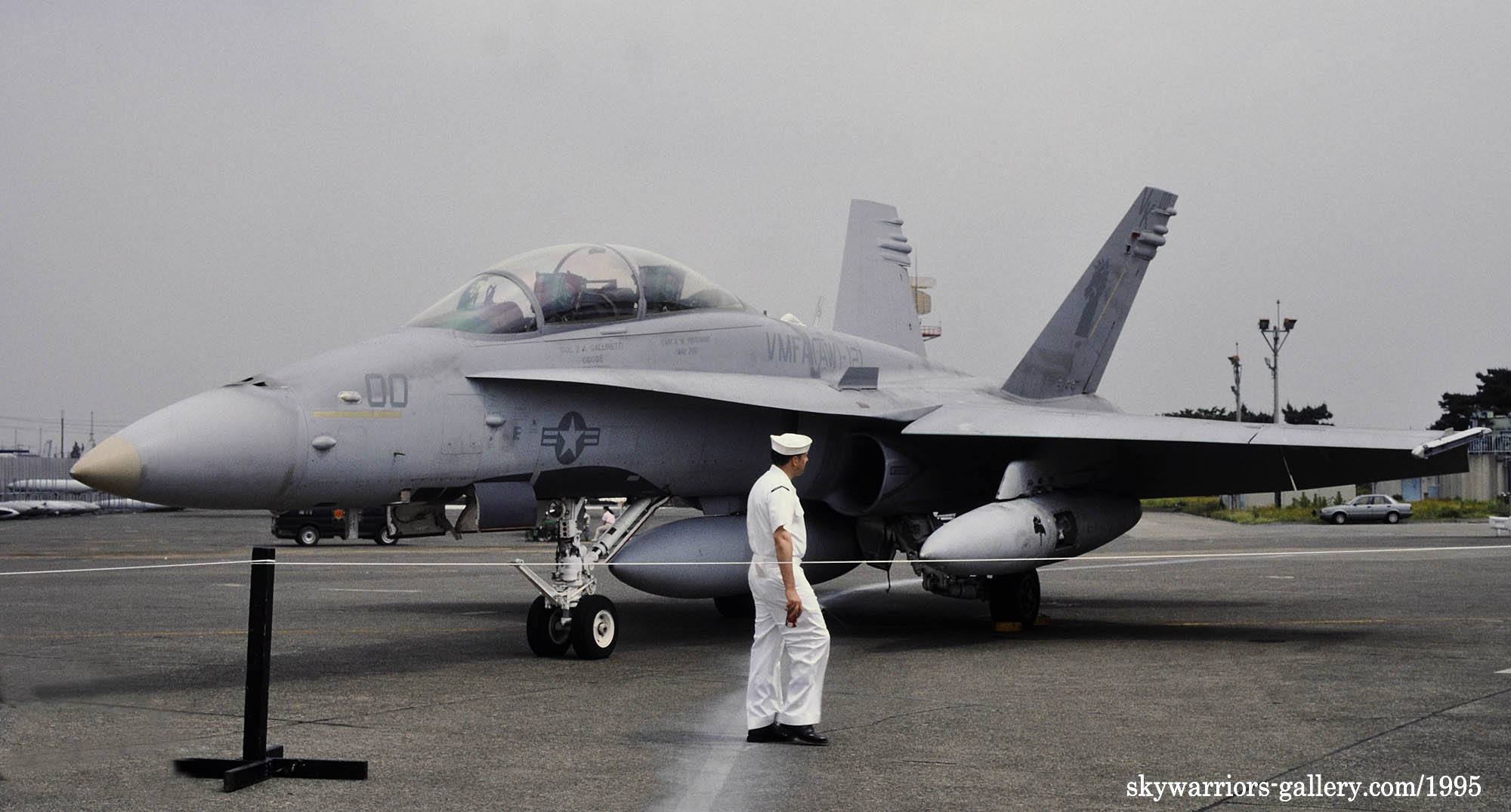 ↑ ↓ 写真は、1995年7月23日横田基地に展示された2機のFA-18D、VK-00とVK-04である。尾翼のナイツは、単調なデザインになってしまっているが、この日 VKのほかにDC、WD、WHとマリン機の展示が多くマニアは大喜びであった。