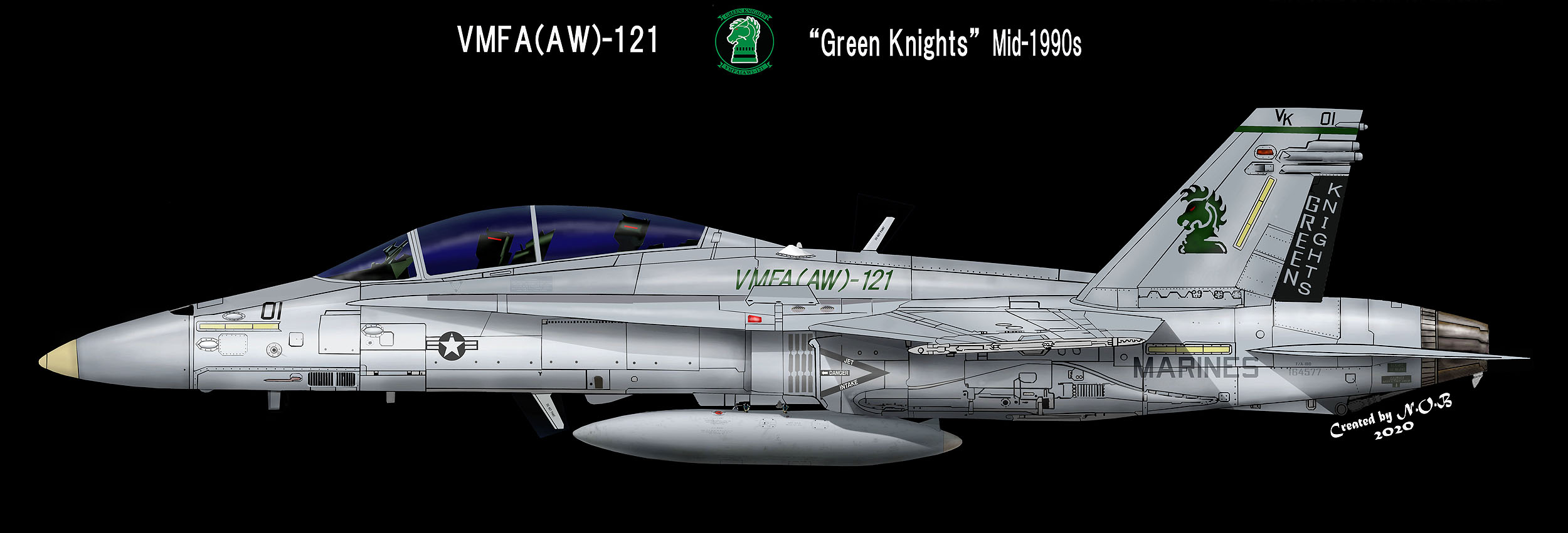 ↑ 1990年代半ば頃にに施されたマーキングで写真も少ないが、カラータイプとグレーの濃淡だけのタイプがあった。マーキングの特徴は、ナイトの描き方がこの時期特有のもので またラダーを濃く塗って部隊名を入れている所であり 初期の塗装としては魅力的なものだった。F/A-18D Bu.No.は、不明。