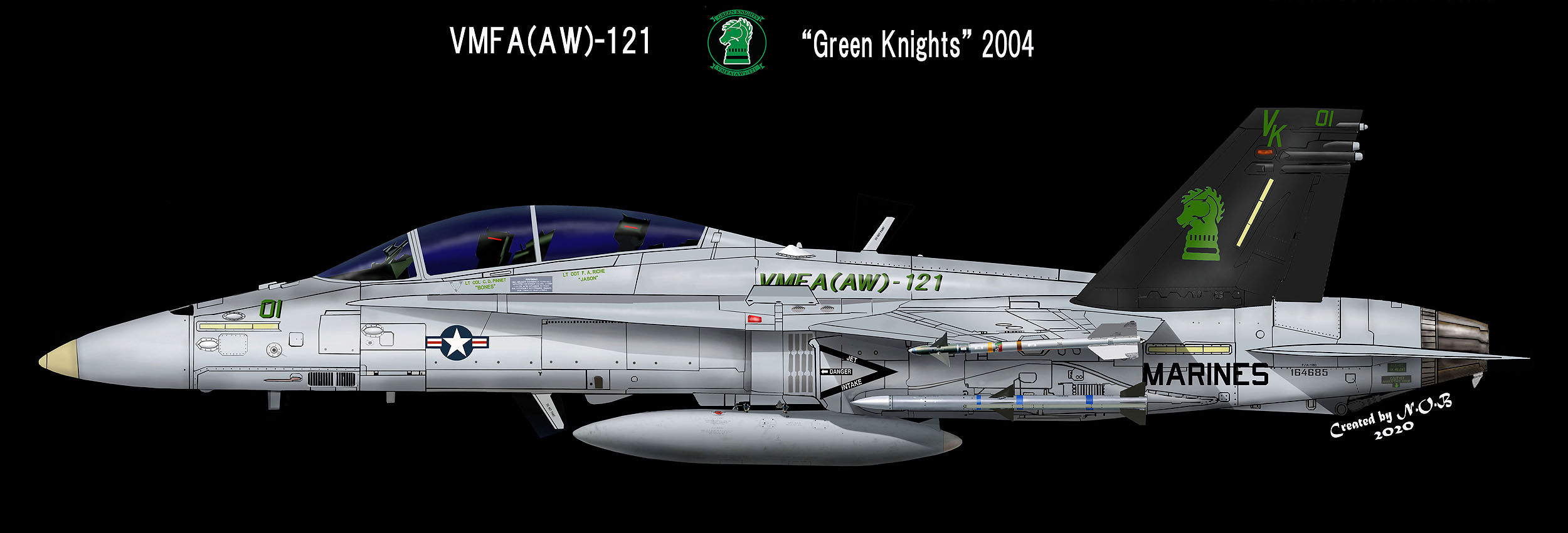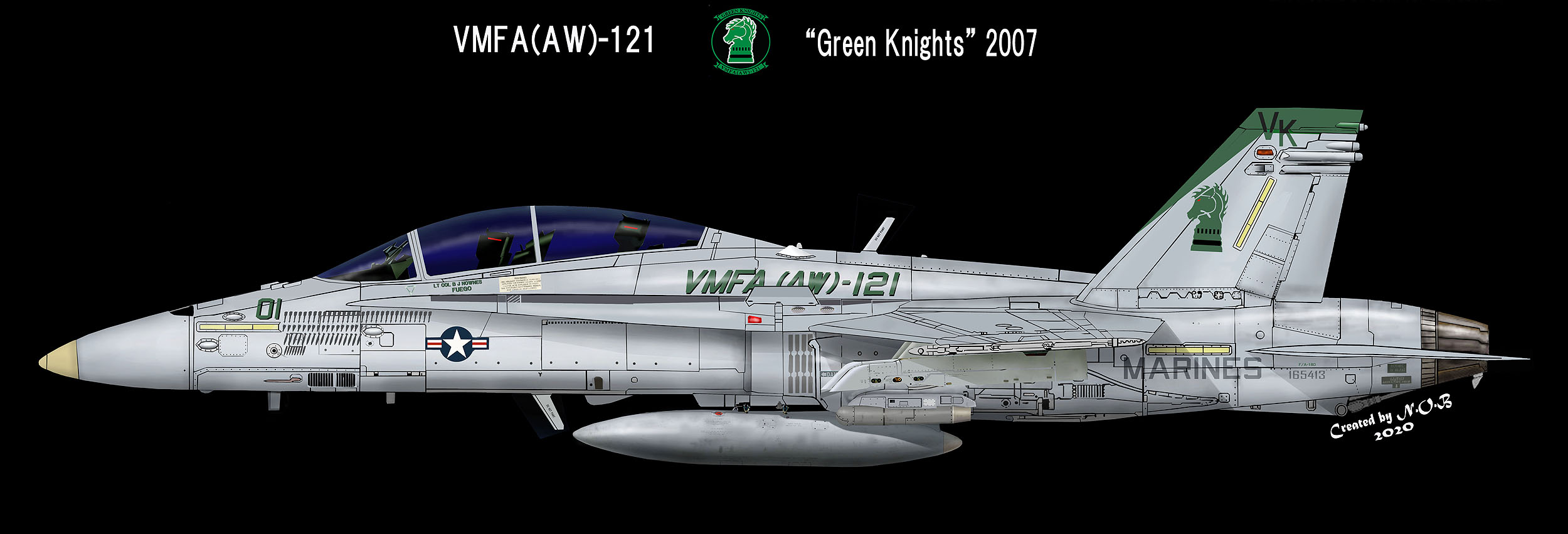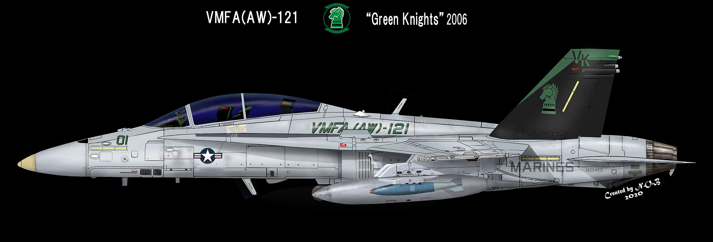 太平洋戦争終了後 しばらく平和な日々が続いてが、1951年1月元旦に突然北朝鮮軍が38度線を越えて南側に侵入、朝鮮戦争が勃発して国連も蜂の巣を突く騒ぎとなった。この年、VMA-121はカルフォルニア州のエルトロ基地で既にスカイレーダー攻撃機の訓練を重ね、朝鮮戦争への出撃準備を整えていた。朝鮮に赴いた彼らの著名な戦果はスイホーダム攻撃任務で、150トン以上の爆弾を叩き込んでいる。朝鮮戦争時代は、部隊ニックネームがコミックのウルフガールを捩りウルフ・レーダースと呼ばれていたらしい。1962年にA-4スカイホークを受領して この頃からグリーンナイツを使い始めたようだベトナム戦にも駆り出され 南ベトナムのチュンライ基地をベースに半年の激戦を戦い抜いた。1969年から前ページでご紹介したA-6イントルーダーを20年間使用し、1989年からF/A-18Dに更新された。。