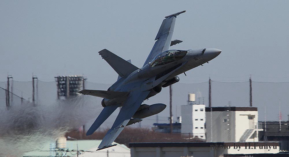上の写真は、いずれもフニュフニュ君の撮影によるもので 厚木基地のテイクオフを捉えたものである、上の1枚はR/W19 16:11の離陸 さすがに2月の午後4時過ぎともなると日が傾くため夕日を浴びているが、嘉手納基地と違い比較的機体の離陸高度が低い・・・・・嘉手納の場合は 滑走路が長いためと離陸の撮影ポイントがランウェイエンドから離れすぎていて、離陸後 航空機が充分高度をとってしまうため撮影条件が厳しいのである。