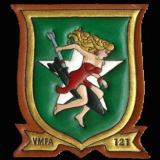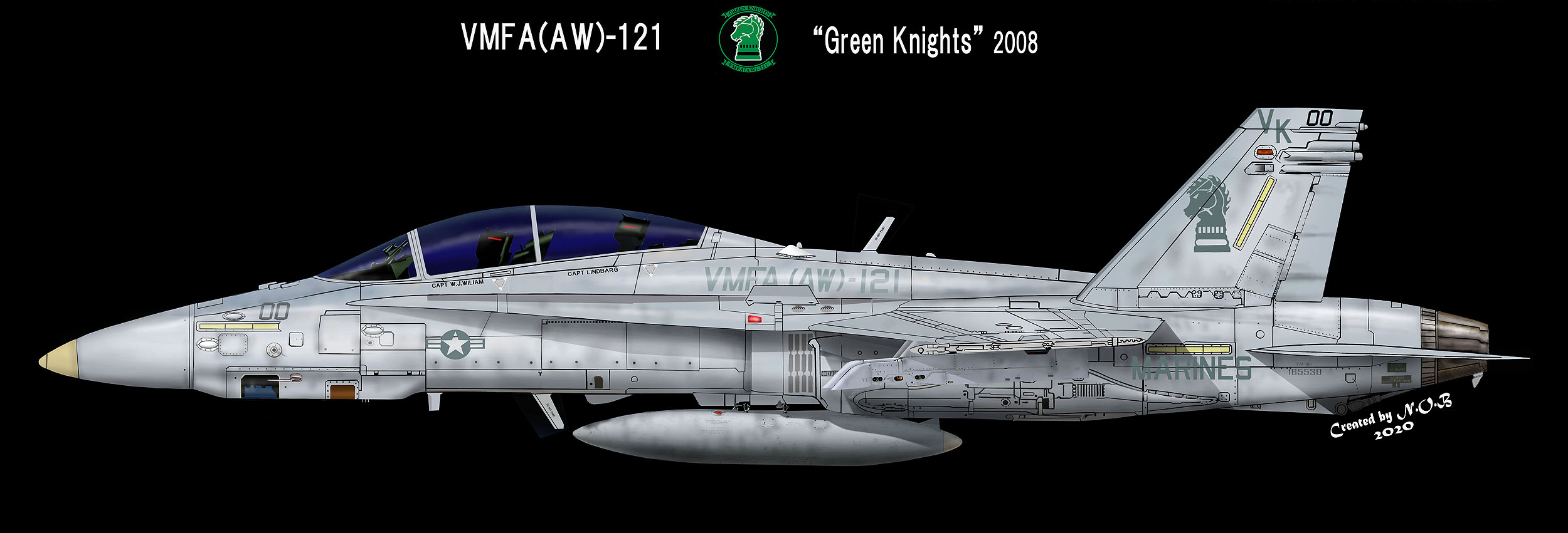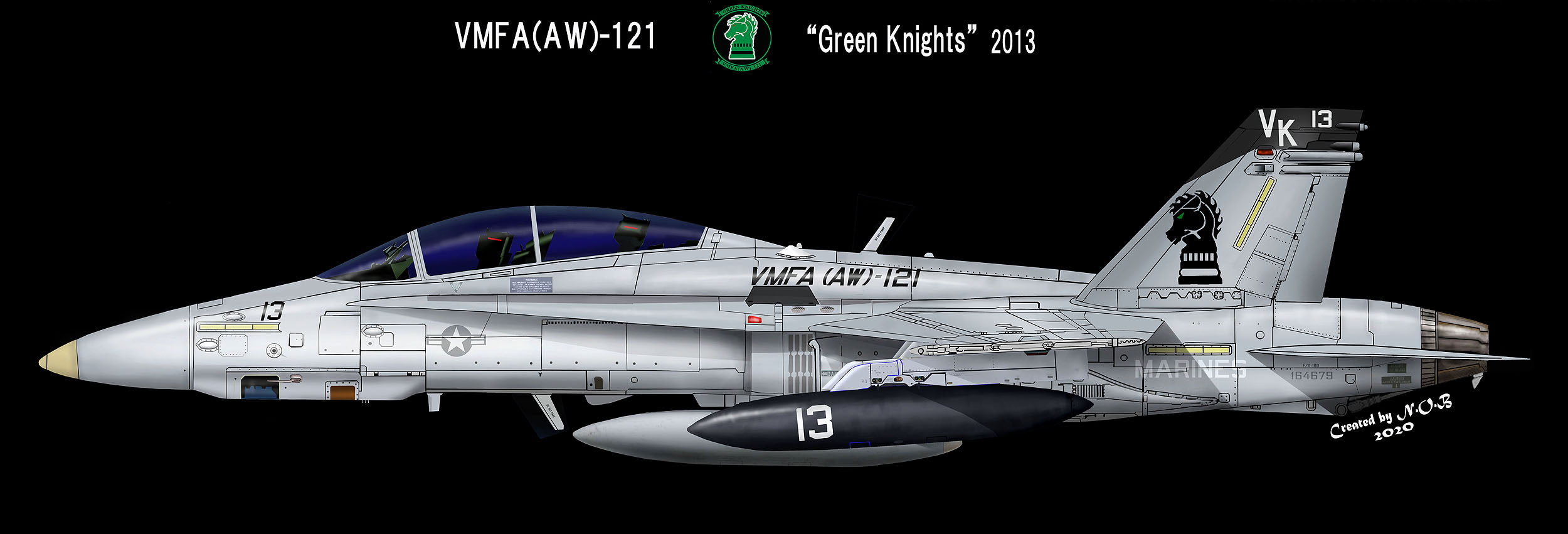 海兵航空隊は、ここ最近 部隊のインシグニアを創設当時のものに戻し、昔を懐かしむのがブームになっているようである。特に太平洋戦争や朝鮮戦争中に活躍した飛行隊は、その栄光をもう一度とばかり昔のインシグニアなどを復活させているがVMFA(AW)-121もその一つである。2010年8月に司令官機を新塗装に変更 そこには従来のグリーン・ナイツは無かった。この新塗装には部隊から6名の隊員が参加して2週間かけて仕上げたらしい。尾翼にある赤いドレスを着て爆弾に跨っている女性は”Bombing Betty”と呼ばれ,、WWU時代からマスコットとして親しまれているようだ。しかし、何に由来するのか判らない。(そう言えば 帝国海軍の一式陸攻は、Bettyだった、関係ないが・・)その後 朝鮮戦争当時のインシグニアが”Wolf Girl”に変わったとあるが これもこのマスコットが関連している可能性がある。但し右写真の”HAVE GUN WILL TRAVEL”の文字は、1960年代日本でも放映された「西部の男 パラディン」の原名であり 主役を演じたリチャード・ブーンの拳銃に刻まれたチェスのナイトが有名である為、部隊名と絡めていることが判る。