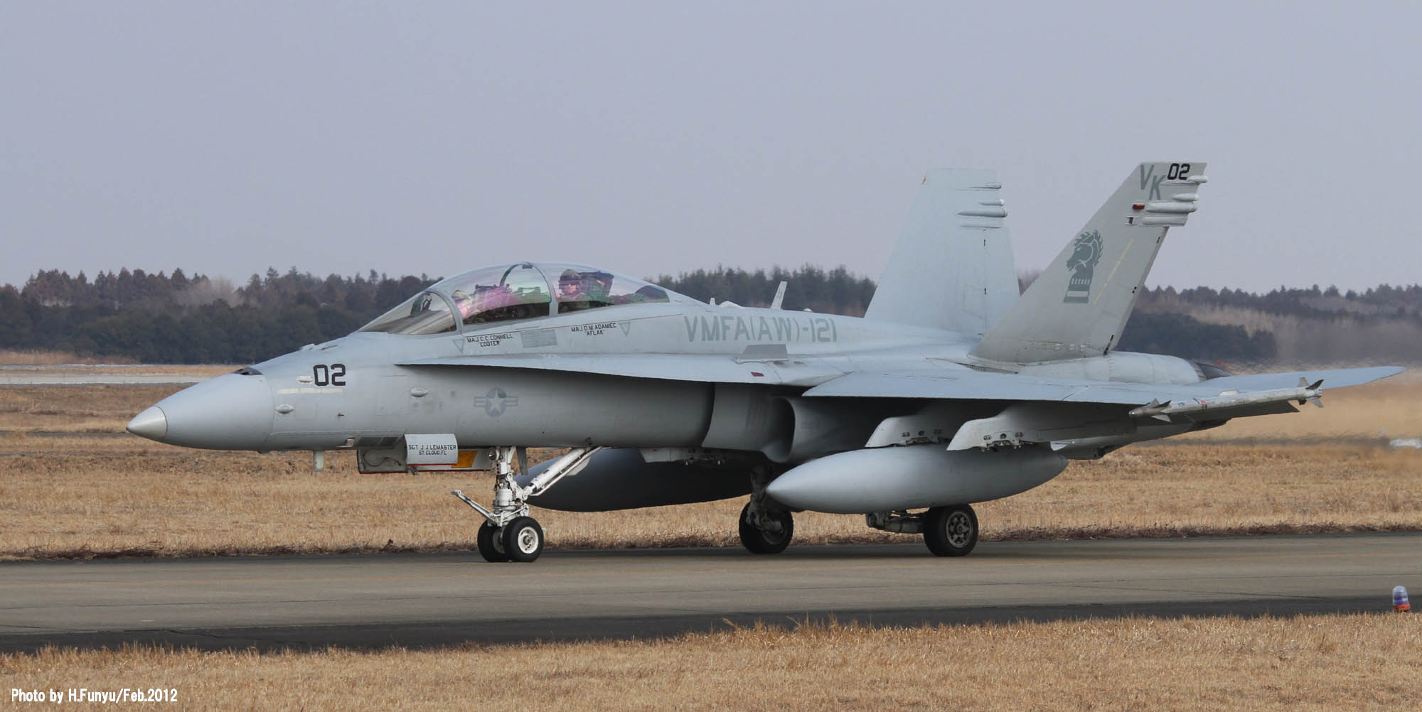 ↑F-35Bに転換される前に施された最後のフルカラーマーキングで 創隊時期のVMF-121時代に使われていたインシグニアとマスコットのBombing Bettyが復活している。一時期海兵隊航空部隊の多くが、創設時代の懐古趣味に転じていて 2010年に登場したこのマーキングもそうであった。F/A-18D