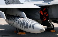 ↑ 2009年に岩国配備となった際 WK-01のブラックテール機とペアで行動することも多かったトラ模様のWK-00。機首は、カメラを取り付けたATARS仕様となっており トラ模様も変化して初代とは違った印象を与える。機体の各所注意書きをしっかりと避けながら虎模様が書かれている。F/A-18D BU.No.164886