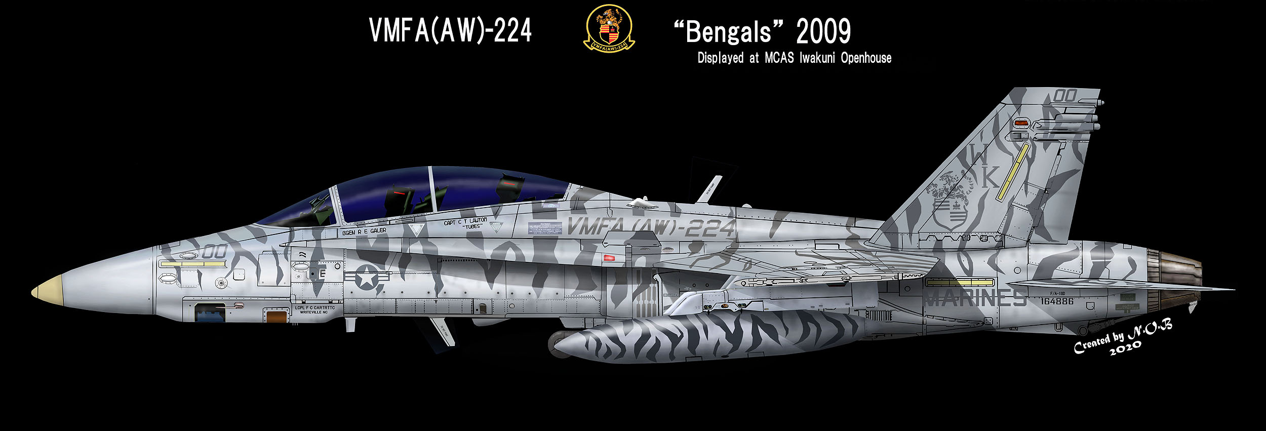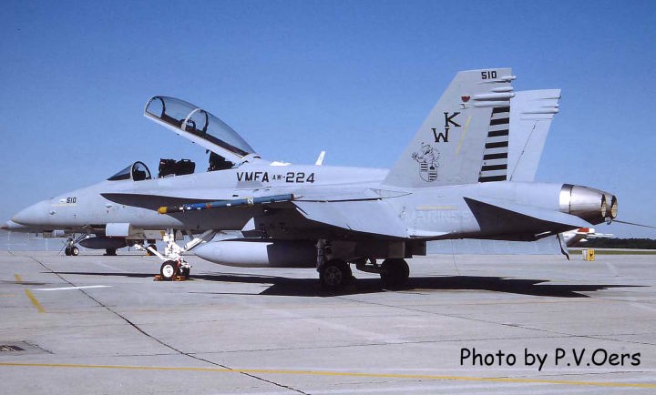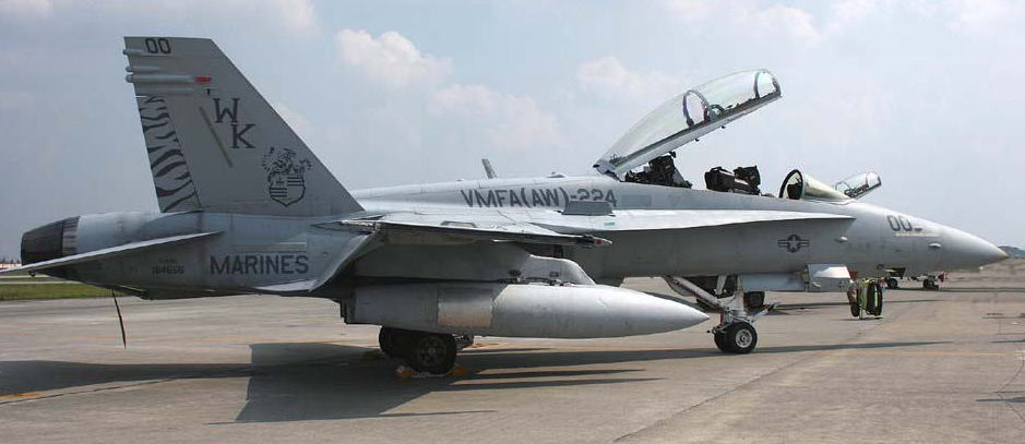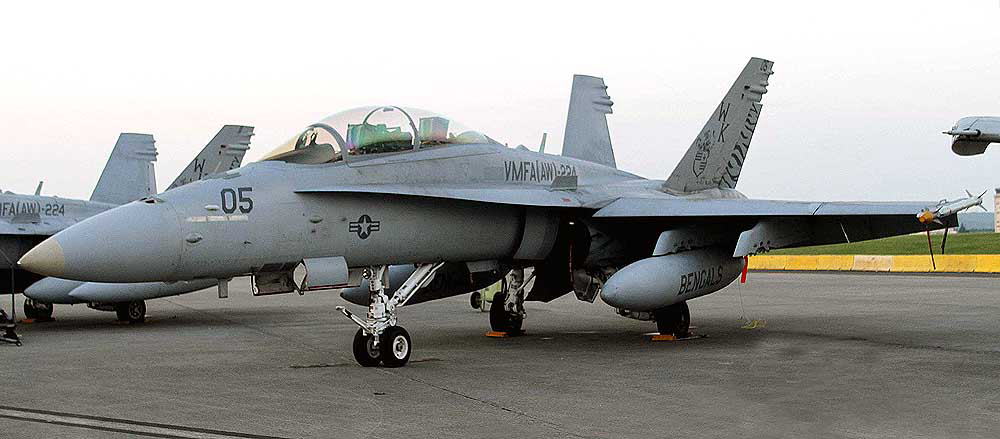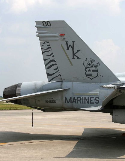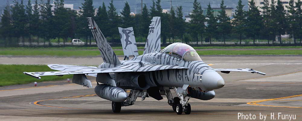 ↑ このトラ模様の機体を最初に見た時はかなり驚いた。海兵隊では機体の全面にこうしたマーキングを入れることが少なかったからであるが、日本にもブラックテール機より早くお目見えして、部隊の存在感を圧倒的なものにしている。この後トラ模様は2代目、3代目と続くが、初代の模様が一番細かく複雑である。F/A-18D BU.No.164884