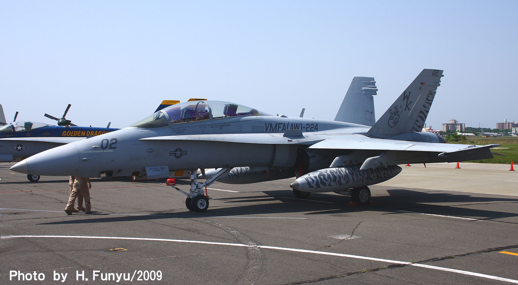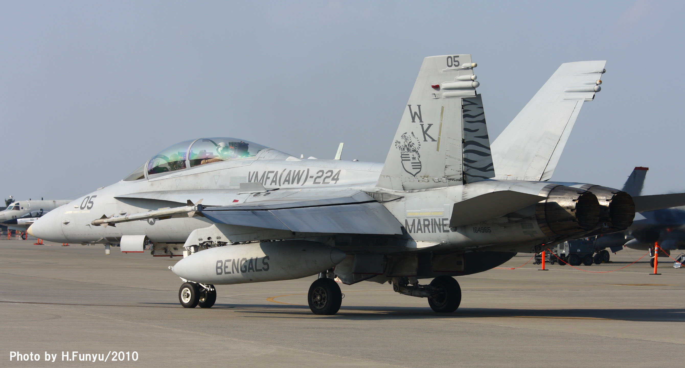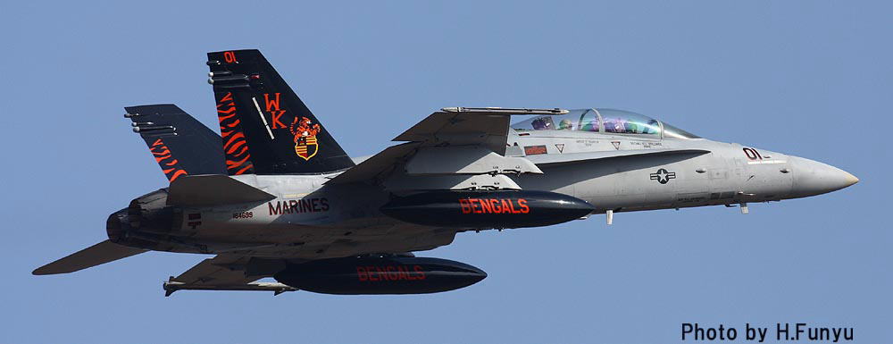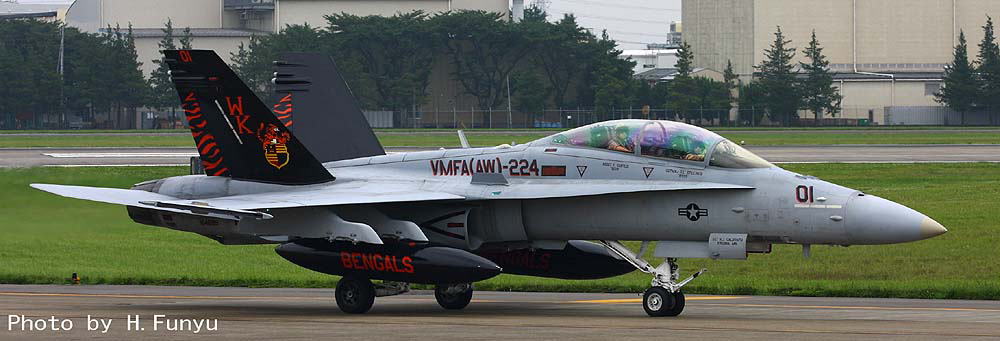 ベンガルスがFA-18Dになってからも 私はあまり撮影の機会に恵まれなかったが、2007年にチャンスが訪れた。2007年の横田基地OPENで、VMFA(W)-224が漸く撮影出来たのだ。無理をして某国より帰国した甲斐があったというものである。残念ながら色の付いた機体ではなかったが、私にとっては貴重な海兵隊機である。エンジンカバーはベンガルタイガー色(?)で色が無くても雰囲気は充分出ていました。しかも燃料タンクの虎模様である。(2007/9/9)