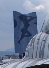 2009年7月5日12;30頃 横田に飛来したVMFA(AW)-224の3機のFA-18D”00””01””04”の内 2機の写真をUPしましょう。WK-00は、久々に2009年4月ごろ施されたタイガーストライプで 2005年にもBu.No.164884にかかれたことがある。右も”WK-00”の尾翼部分で フニュフニュ君が岩国公開で撮影したもの。2005年の時とパターンは若干異なるようだ。航空雑誌によれば このスピードブレーキにかかれたシルエットは、マリリンモンローだそうで 1942年の部隊創設時のロバート・ギャラー少佐の遺品にモンローの肖像があった事から 敬意を表して書かれたそうである。