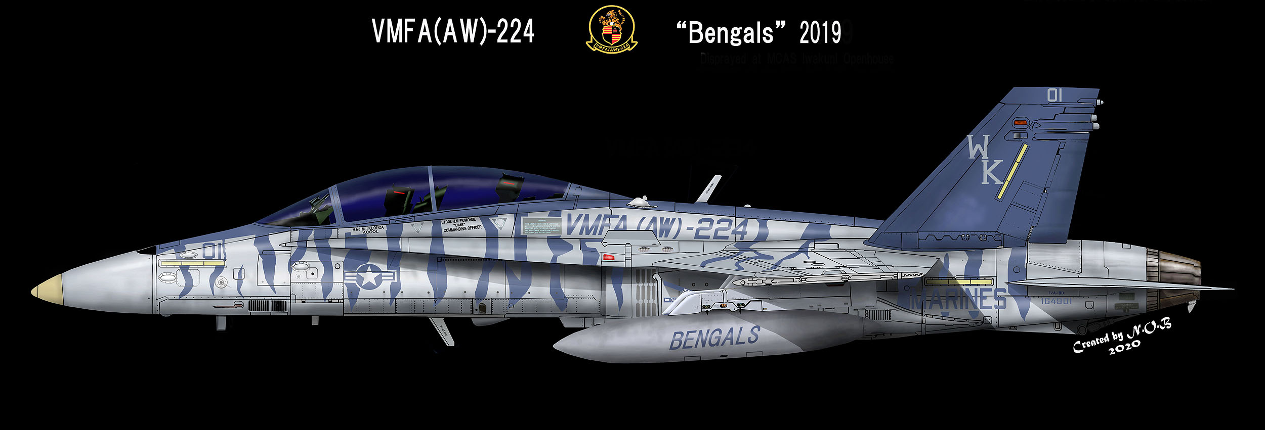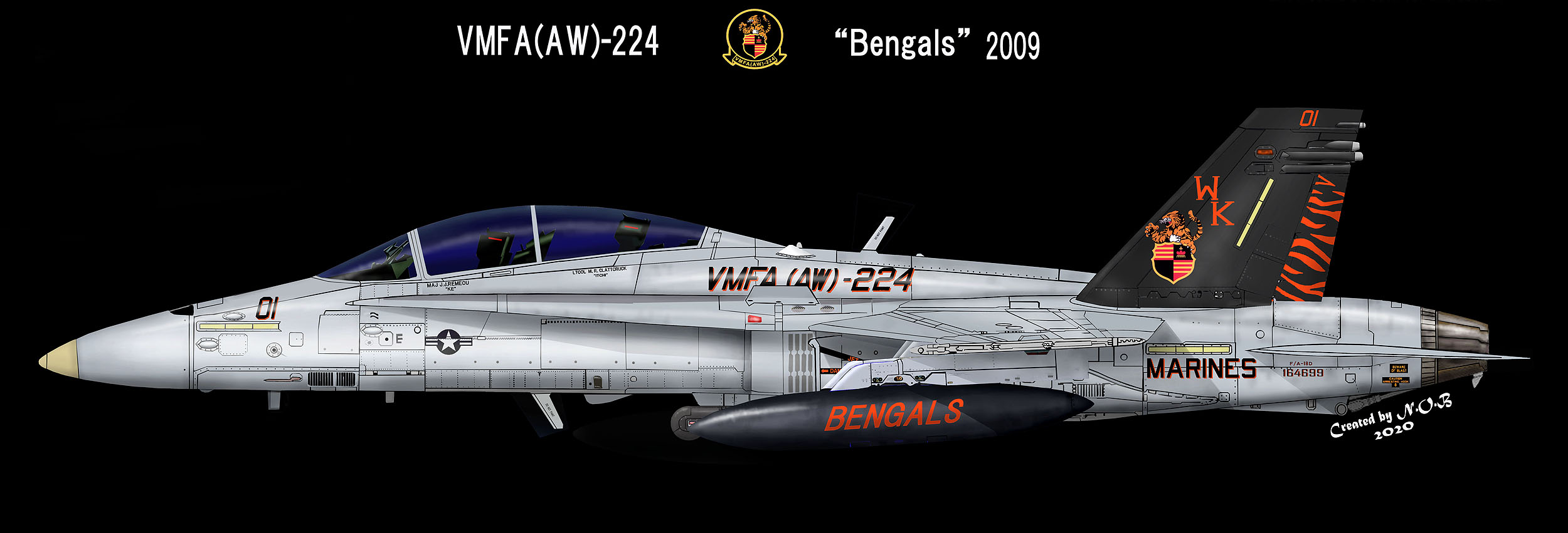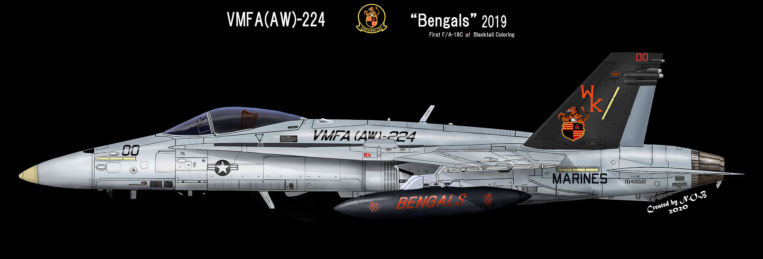 ↑2004年にMCAS ミラマーで展示されてデビューした初代ブラックテール機である。この機体はラダーだけがトラ模様であり 尾翼のインシグニアとテールレターは、グレー色であった。同時期に全身トラ模様の機体が「WK-00」に施されたのでそちらにスポットが当たり この機体の注目度は低かった。F/A-18D Bu.No.164694