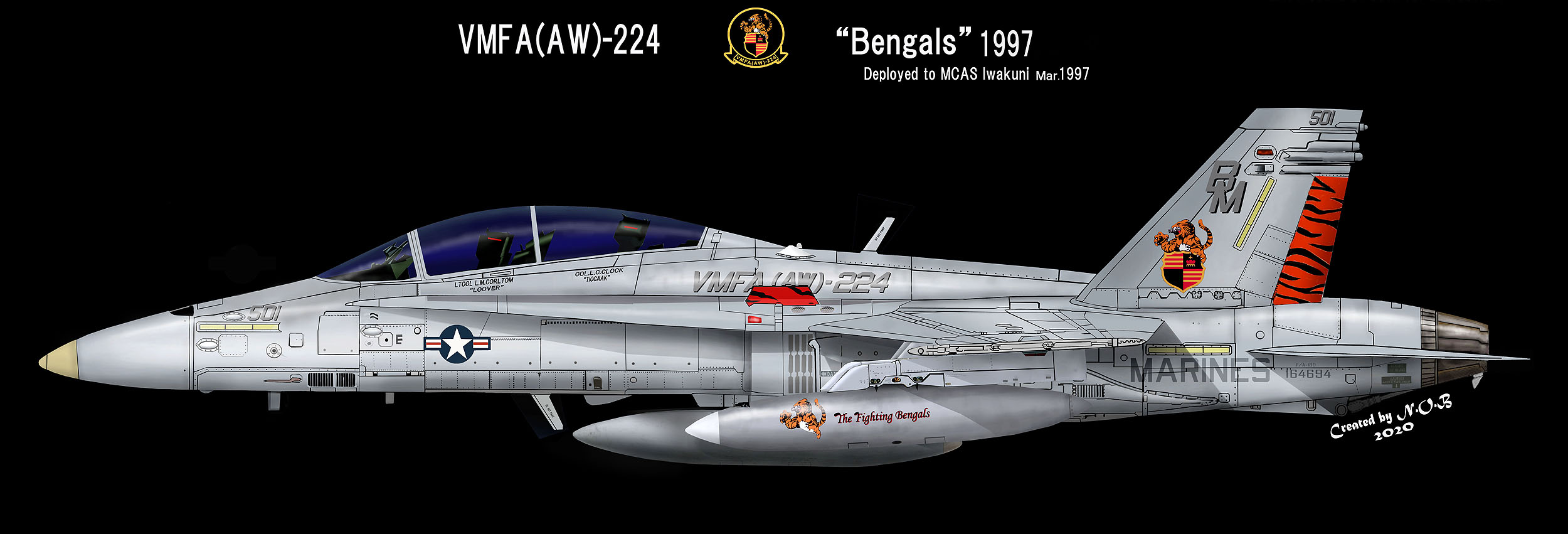 ↑1997年7月岩国海兵隊基地で撮影された新たなカラーリングの機体。部隊ナンバーやテールレターは、グレーで黒のシャドー付、機体上部の整流板にもトラ模様が入っていた。当時は燃料タンクに「The Fighting Bengals」と書き込んでいた為、これが正式部隊名と誤解されることもあったが、正式には「Bengals」のはずである。F/A-18D