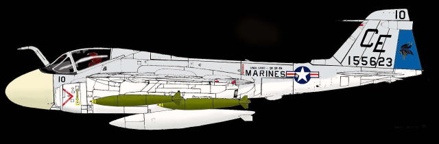 1943年1月にカルフォルニア州モハーベで誕生した部隊で 太平洋戦争中は、ニューヘブリデス島を周辺の戦闘に参加している。ベトナム戦では A-4Bスカイホークがあてがわれて1965年5月にチュンライに移動し、、南ベトナムのベトコン勢力に対して攻撃を加えている。ベトナム戦の途中で一度アメリカ本国のMCASチェリーポイントに戻り そこで新鋭機A-6イントルーダーに機種転換して1968年に再びチュ・ライへ赴いた。また1969年にはダナンにも派遣されている。ここでは ホーチミンルートのコンボイの捜索とルートの破壊を任務としたようだ。当初の部隊名は、”Vagabond”であった。岩国に配備されたのは、FA-18Dになってからで それまでこの部隊の存在自体を私は殆ど知らなかった。尾翼に描かれているバイキングの横顔はA-6使用の時代から使用していたものである。