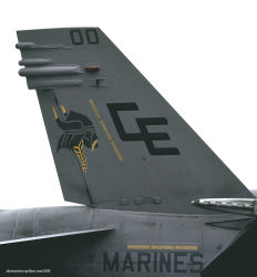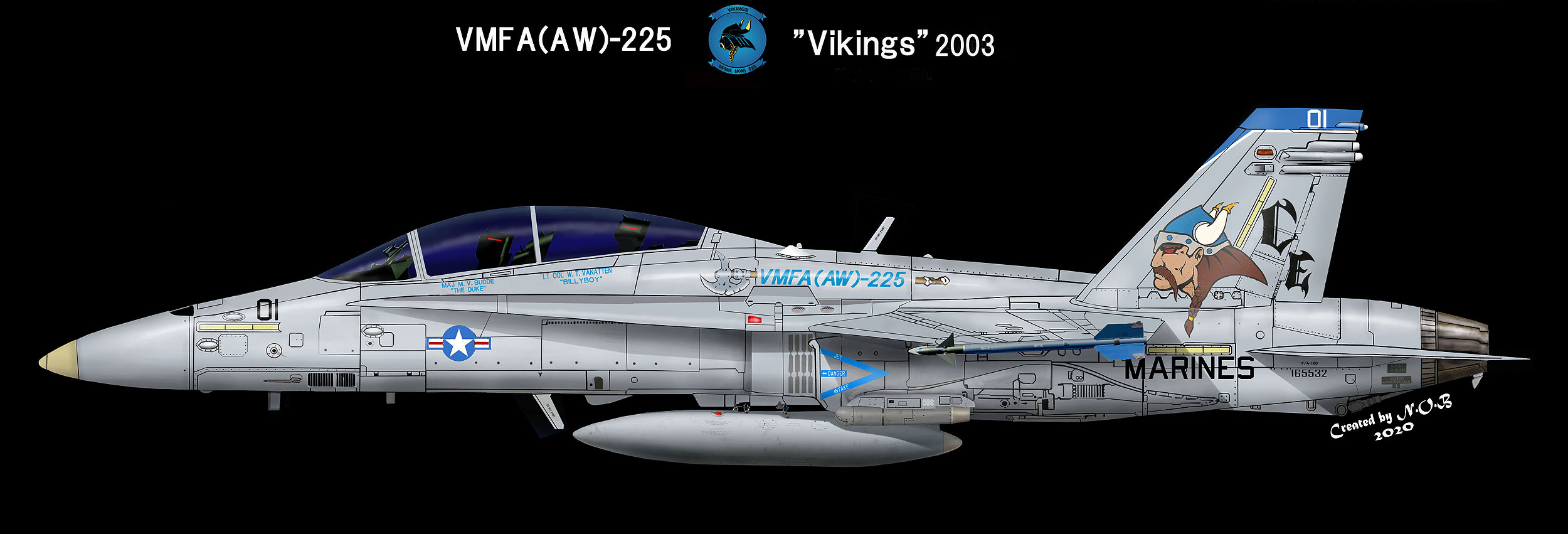 ↑ バイキングのリアルな絵柄を尾翼に入れた最初のフルカラーマーキング、バイキングとは、海賊とか襲撃者を示す言葉だが、スカンジナビア半島にいたノース人がモデルとなっている。彼らは、略奪だけではなく未開地の開拓者としても活躍した。この機体1997年に岐阜基地に展示されたが、翌年にはデザインが変わってしまった。胴体左右に書かれた武器は其々異なる。F/A-18D Bu.No.164245