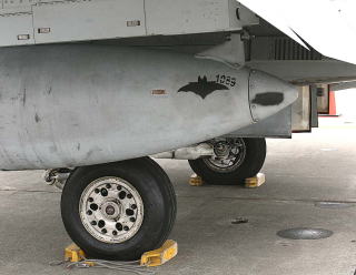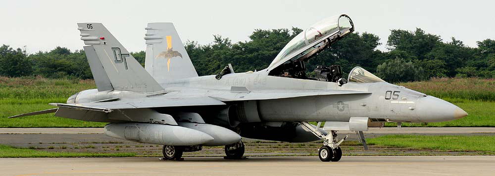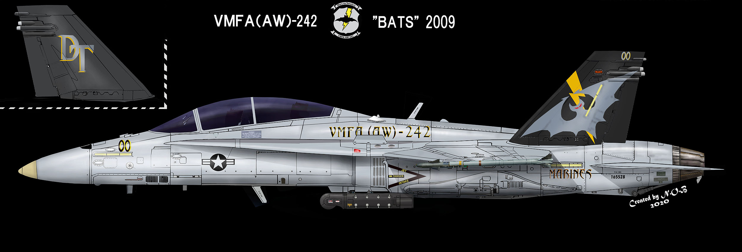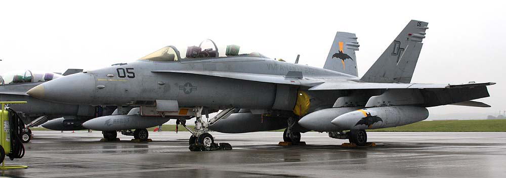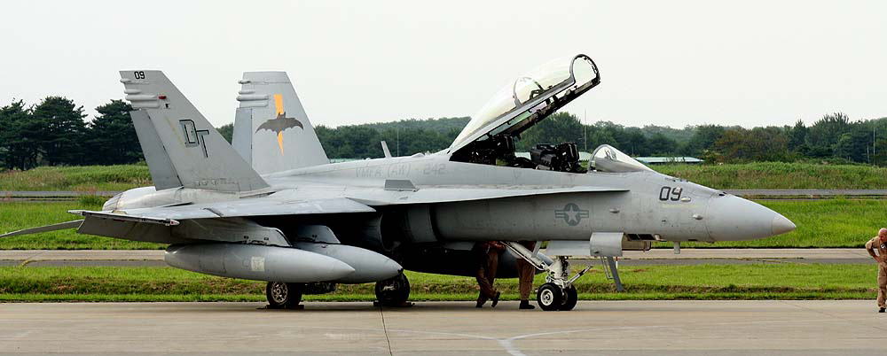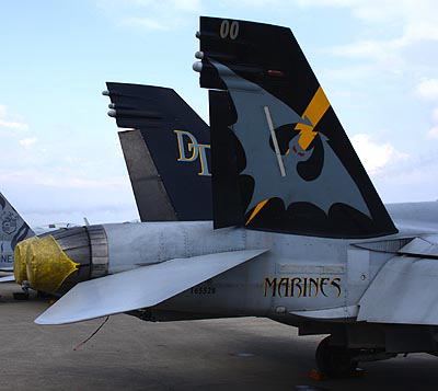 ↑ 2009年日本の岩国で塗装されたマーキングで、初めて蝙蝠が両尾翼の外側に大きく描かれた。”MARINE”の文字もオカルト風に書かれ 5月のオープンハウスでも展示された。テールレター”DT”がセンチュリー文字となっている。F/A-18D Bu.No.165528