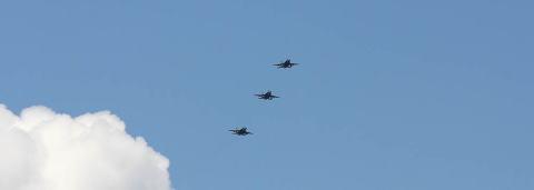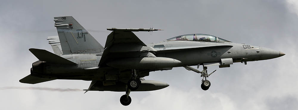 ルーズな3機編隊(2機編隊+1?)で嘉手納に帰ってきたDTのFA-18D。 2010年8月25日11:40分