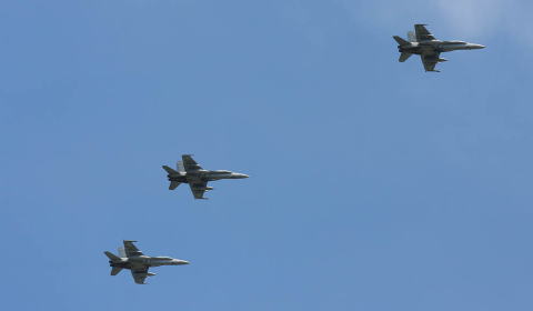 後方にいたFA-18Dは、2機のペアを抜き去って先頭に立つ。各機 片翼にAAM-9Xを1基装着。