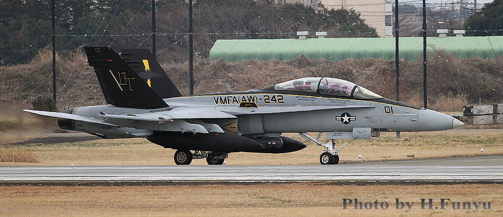 ↑ VMFA(AW)-242 の隊長機新塗装・・昔のデザインの踏襲であるが一番それらしいマーキングに回帰してくれた。”暗黒からの死”のロゴが燃料タンクに移ったのが特徴。作品は全てフニュフニュ君が、2016年3月12日に厚木で撮影したものである。私の好きなタキシング・・・羨ましい限りだ。フニュ君毎回有難うございます。
