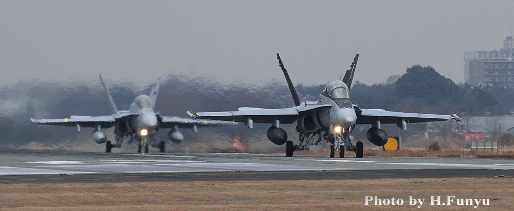 ↓ 2013年1月4日 厚木R/W01を離陸する2機のFA-18D、実に良い捻りである。