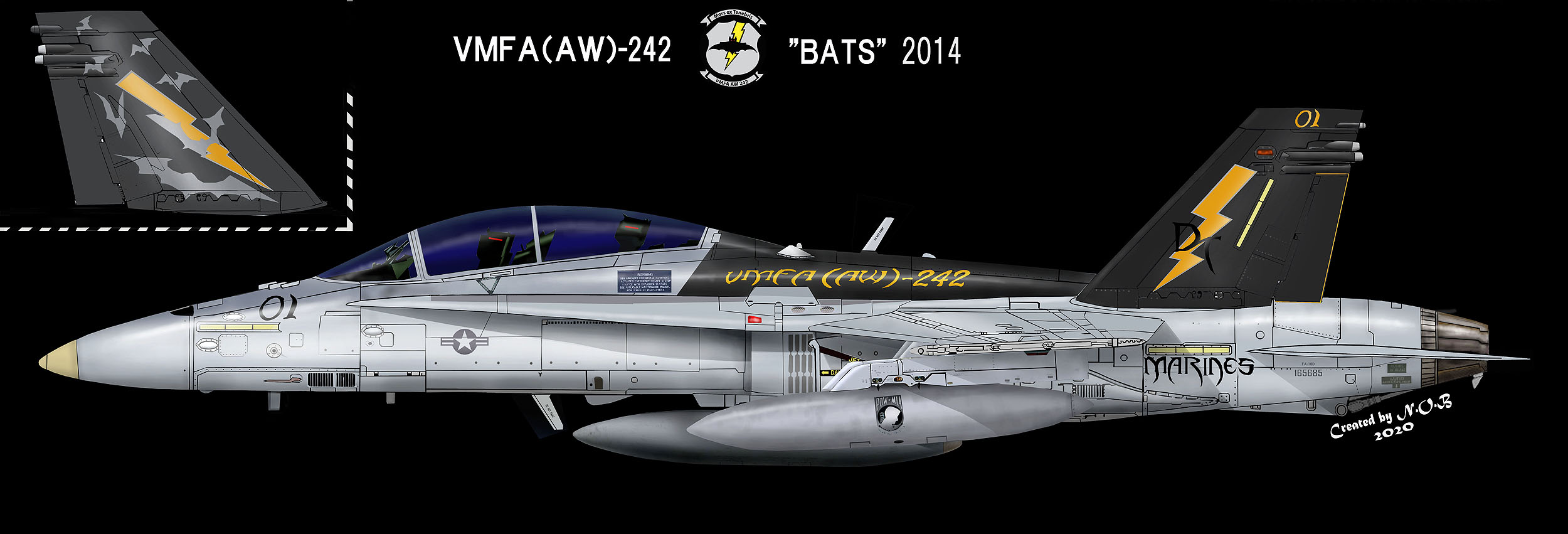 ↑2014年の司令官指定機として確認された機体で、ブラックテールの発展型?として胴体中央まで黒色のベルトが伸びた。両尾翼の内側のマーキングは一斉に飛び立つ蝙蝠の群れを表現した初めてのもので、オカルト風文字もすべて新しいものに切り替わっている。テールレターは電光に重なるように書かれているが、同じ黒を使っているのでわかりにくい。F/A-18D Bu.No.165685