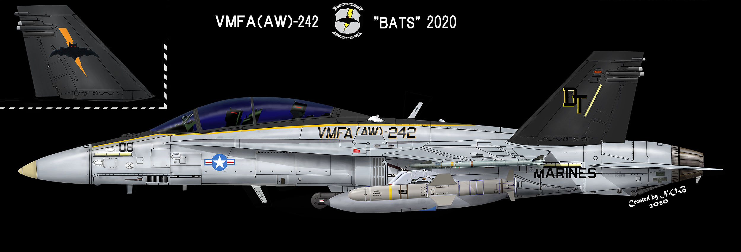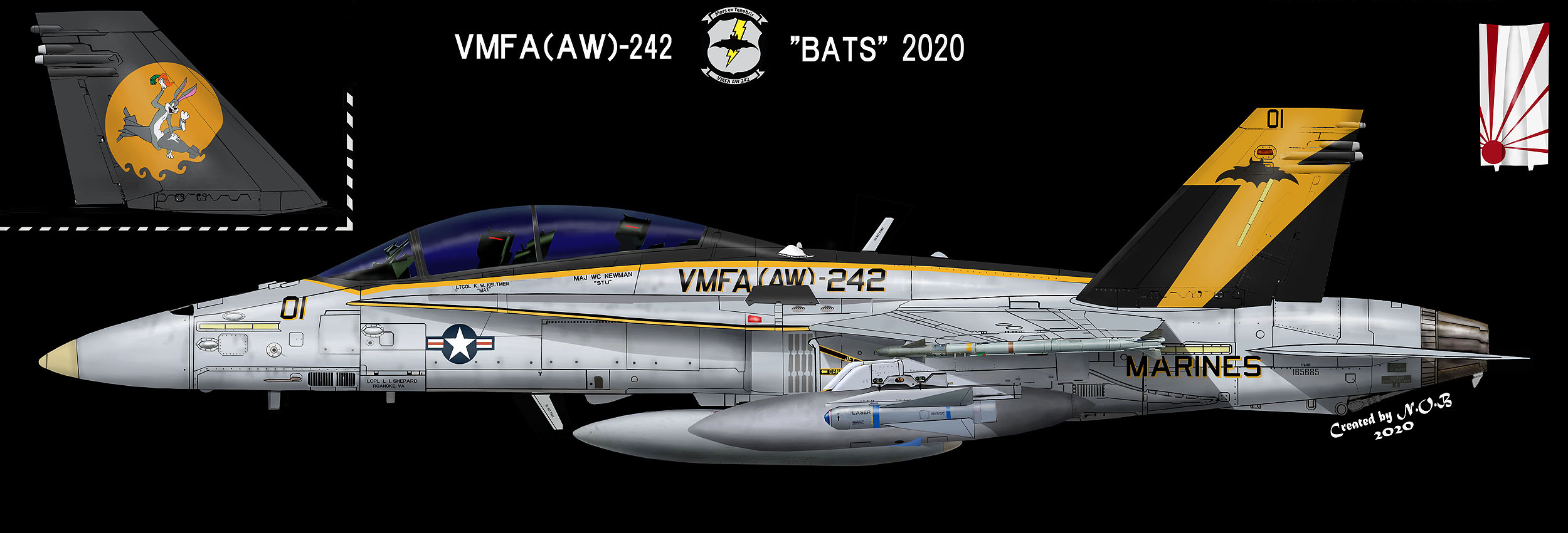 2↑ 2020年岩国におけるF/A-18D最後の年に書かれたマーキングで、8月には横田基地にも飛来して多くのファンを歓喜させた。この時 “DT-08”もブラックテール塗装で、ペアで行動することも多く塗装の比較が面白い。この機体の特徴は、両尾翼外側の電光が大きくなったこと。右尾翼内側には、”EST DT 1943”,右尾翼内側は、第二次大戦中の同部隊VMTB-242のインシグニアを一部変更して書いてある。但しバニー君が乗っている魚雷がレーザー誘導爆弾に変わっている。F/A-18D Bu.No.165685