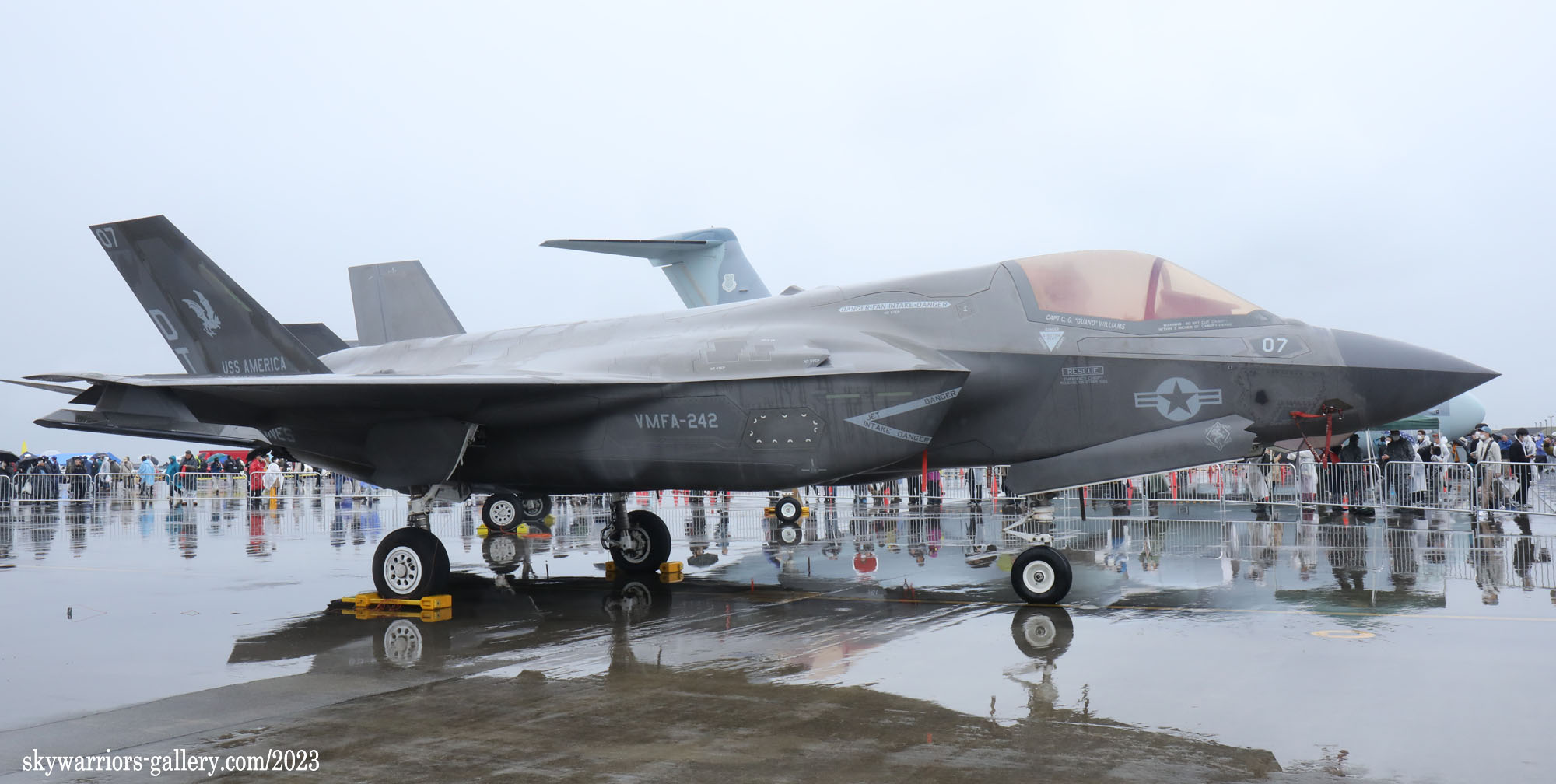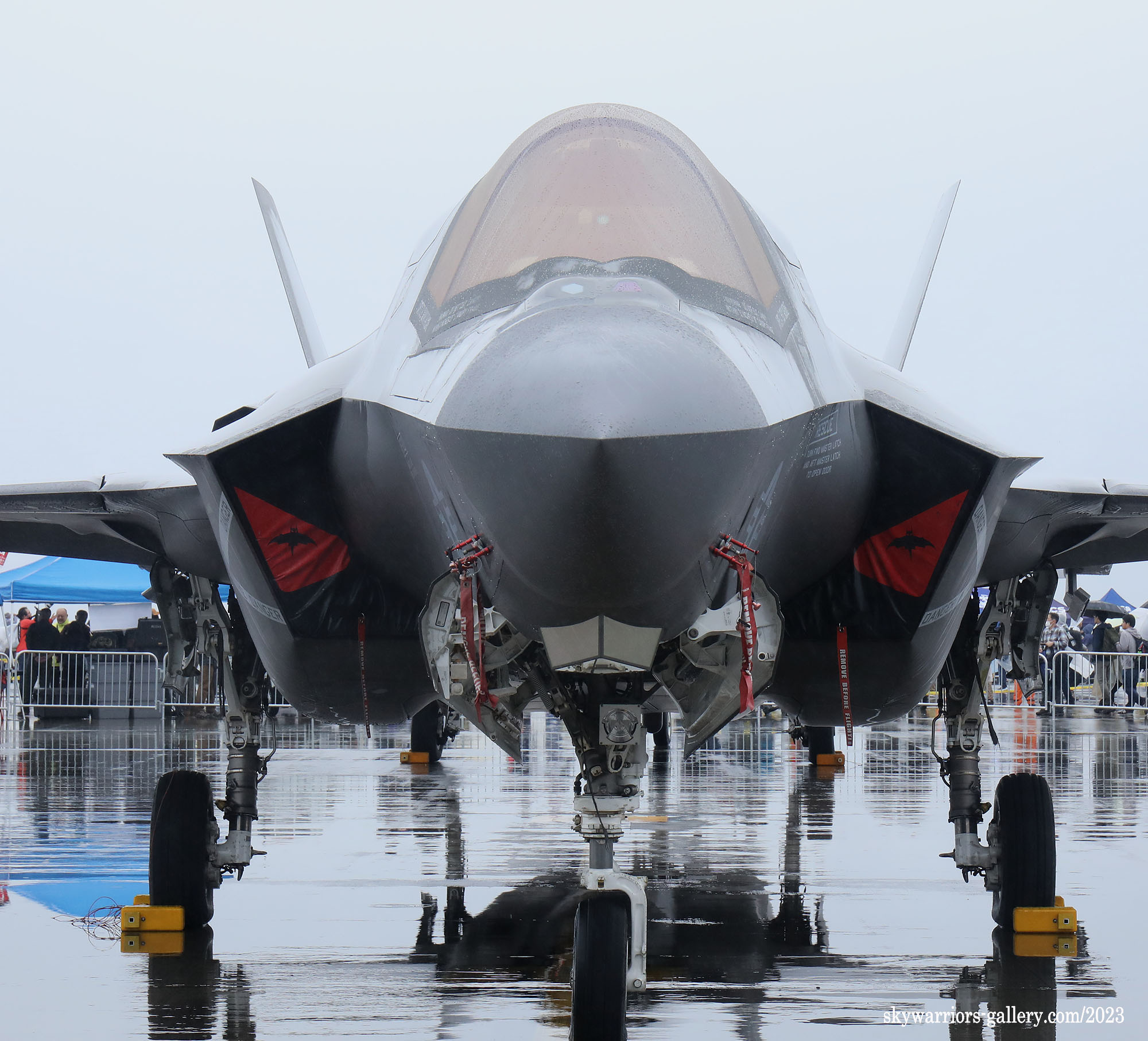 デビュー当時は、海兵隊でも航空自衛隊でもかなり神経を使って取り扱われたF-35A/B。年月が経つにつれ、航空祭でも一般的に展示されるようになり、より身近な存在となりつつある。但し、機体に触れる事はまだ許されておらず、必ずロープを張って 一般客との距離を置いて展示される。やはり ステルス機能の一部である表面の仕上げや塗料については剥がされないように注意が必要なのであろう。2023年4月15日 岩国基地に展示されたVMFA-242の機体をUPしたい。 (2023年4月 記)