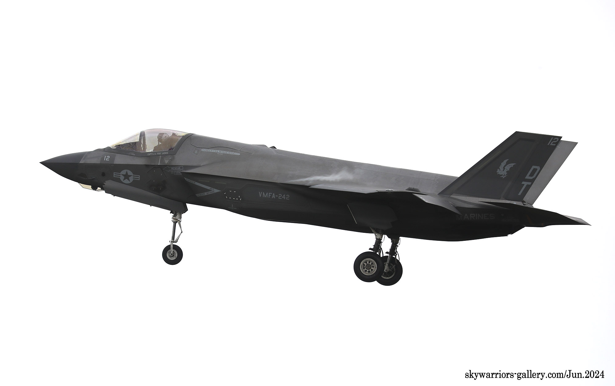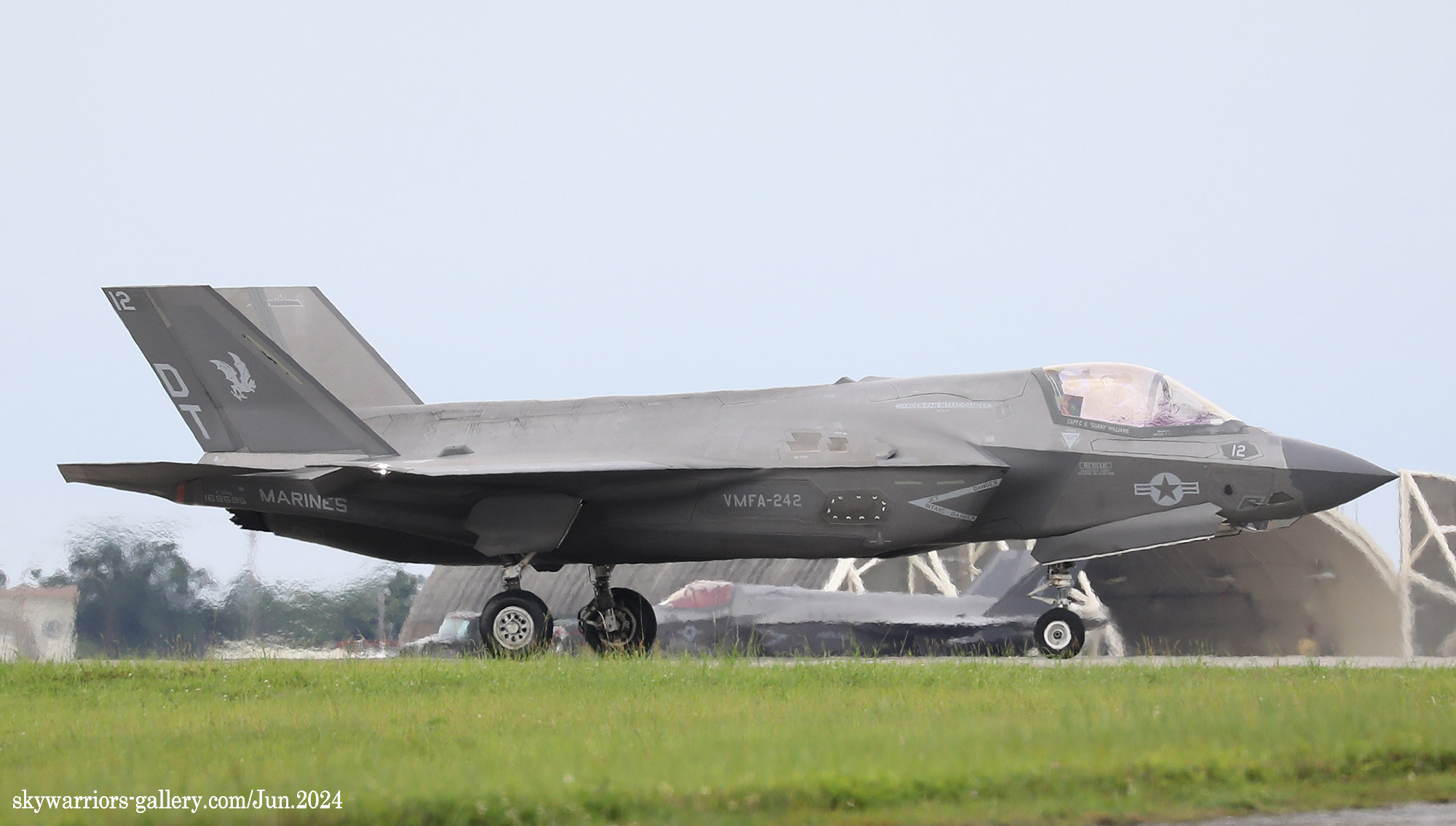 ↑ 2024年6月10日6機程度の規模で嘉手納基地に飛来し、現地でホットピット給油をしながら訓練飛行を繰り返したVMFA-242のF-35B。DT-12号機の背景にエンジンをかけたまま給油を受ける機体が見える。
