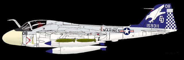 第二次大戦中は、夜間戦闘機部隊だった同飛行隊は、赤い悪魔がマシンガンを連射する絵柄をインシグニアにして"Black Mac's Killer”と言う愛称を持っていた。ブラックマックとは、夜間レーダー索敵の先駆者と言われ、海兵航空の夜間戦闘機隊VMF(N)-533の最初の指揮官でもあったマリオン・M・マグローダー大佐のニックネームらしい。当時最新鋭全天候攻撃機A-6Aを受領したのは、ベトナム戦の最中の1965年で、南ベトナムのチュンライ空軍基地に配属されて、1967年から足掛け3年で10000回の出撃を行い、多くの功労賞を受賞している。1967年のハノイ郊外のフクエン空軍基地攻撃の成果は特に評価され パイロットの中には海軍十字章を受章した者も輩出している。(2023年6月 記)