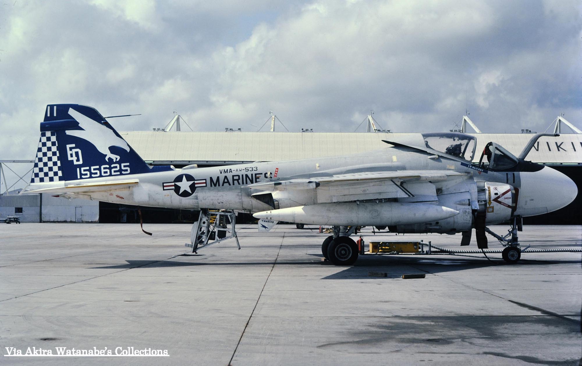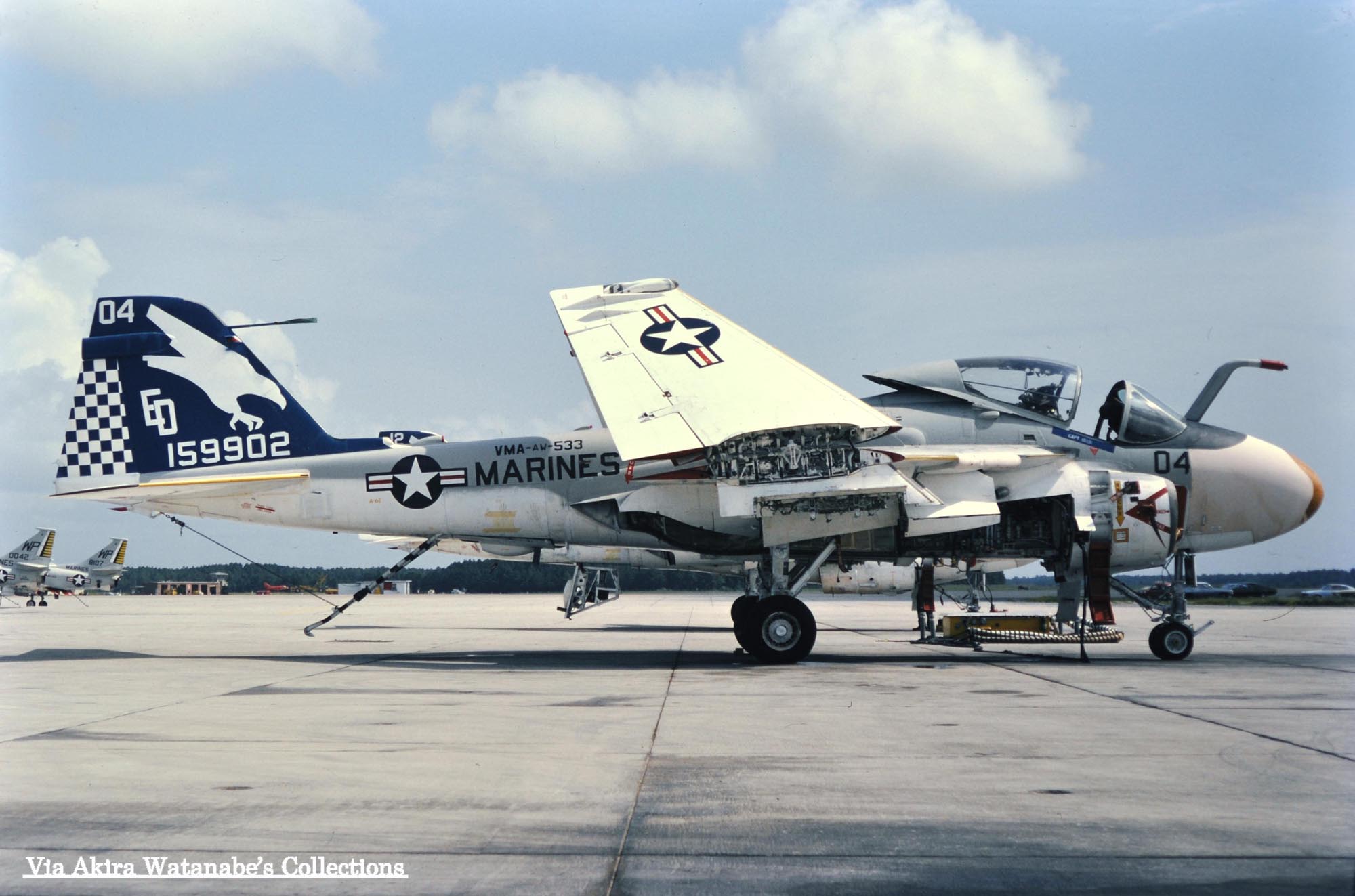 ↑ 1978年9月チェリーポイントで撮影されたVMA(AW)-533のA-6A/Bu.No.155625。この機体もA型として生産され、E型に改造されたもので 1987年8月にチェリーポイントで離陸直後に墜落して失われている。