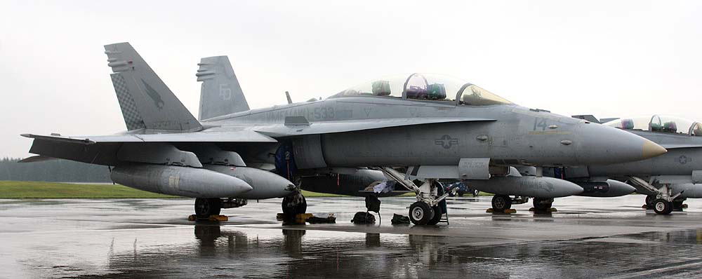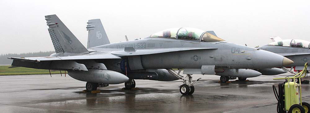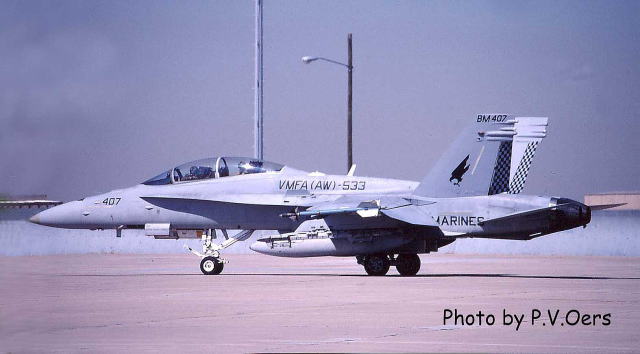 VMFA(AW)-533のFA-18Dに 機種改変した後も日本にはあまり飛来しない部隊の一つである。2001年1月に岩国に6ヶ月いたが、その間は、航空祭そのものも少なく 僅かしか撮ることができなかった。MCASビューフォートに所属する飛行隊は、ビューフォート以外に地域に派遣される際は、テール・レターを”BM"にしなさいとの アホくさい命令のお陰で 日本のマニアは、”BM"レターの機体ばかり撮ることになった時期もある。