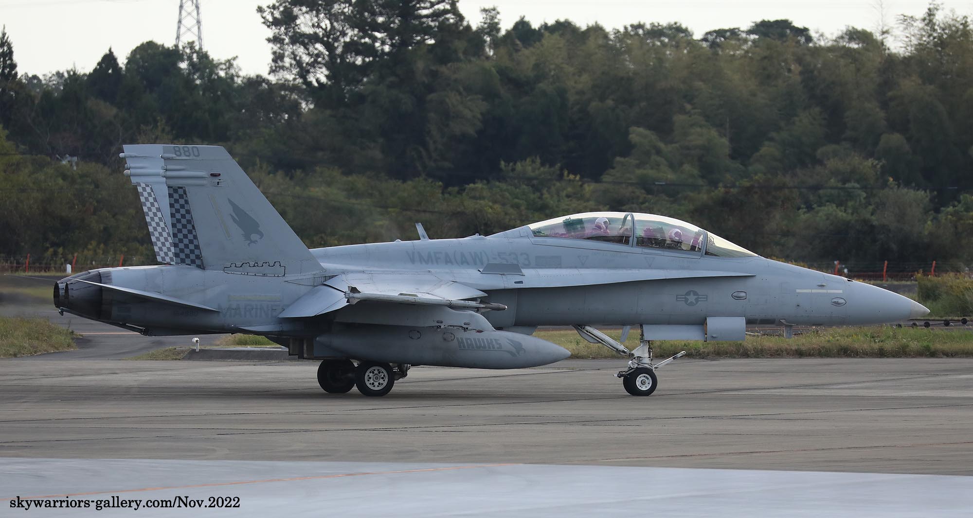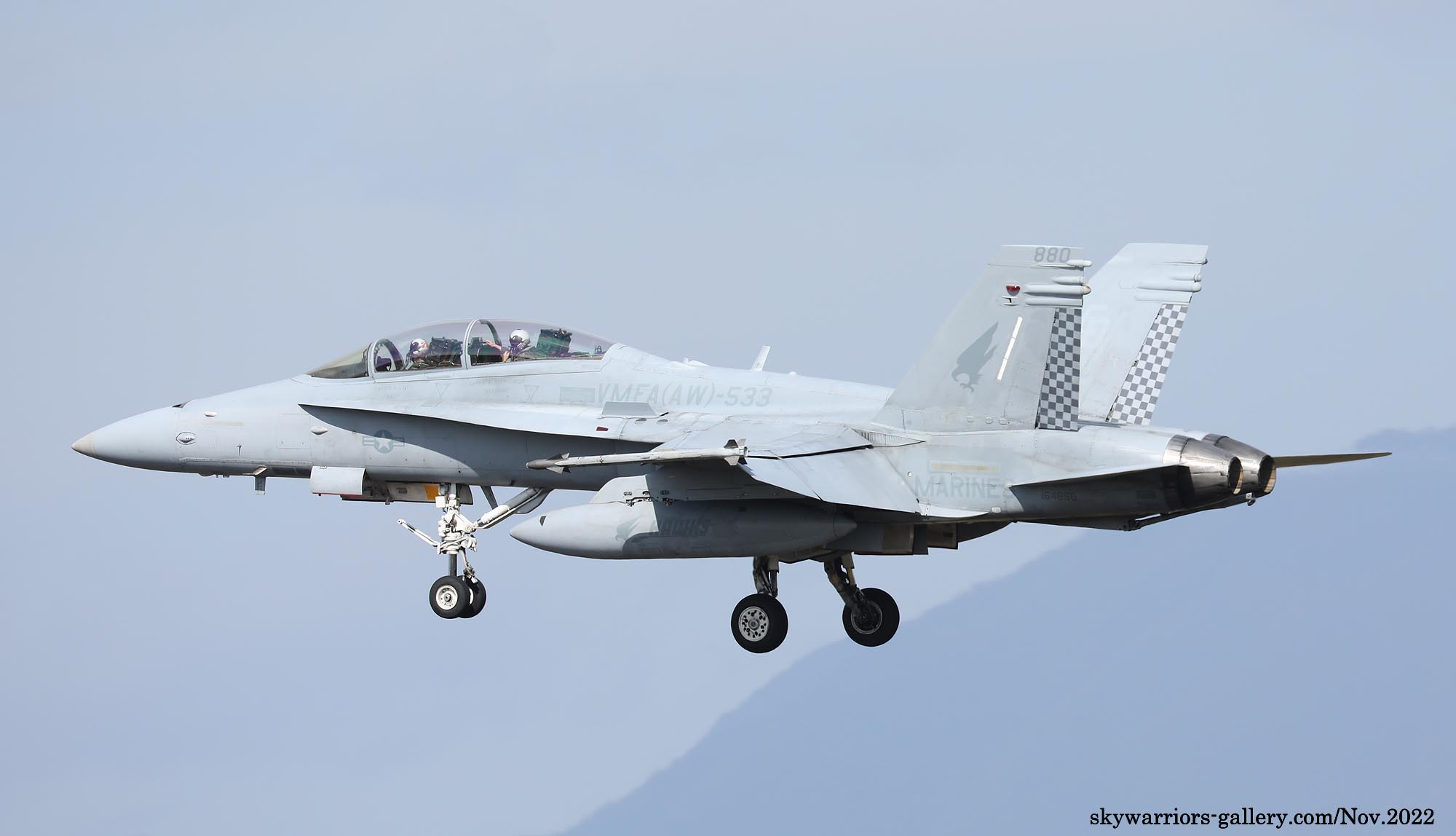 ↑ 2022年11月15日新田原基地に飛来し、夕方岩国基地に帰還したFA-18D/164880。VMFA(AW)-533のマークを残したままであるが、本当はVMFA-312の所属に変わっている機体。しかし、私としてはこのマーキングのまま撮れたのは幸運だった。1996年頃は、全身をダークブルーに包んだ隊長指定機だった機体でもある。