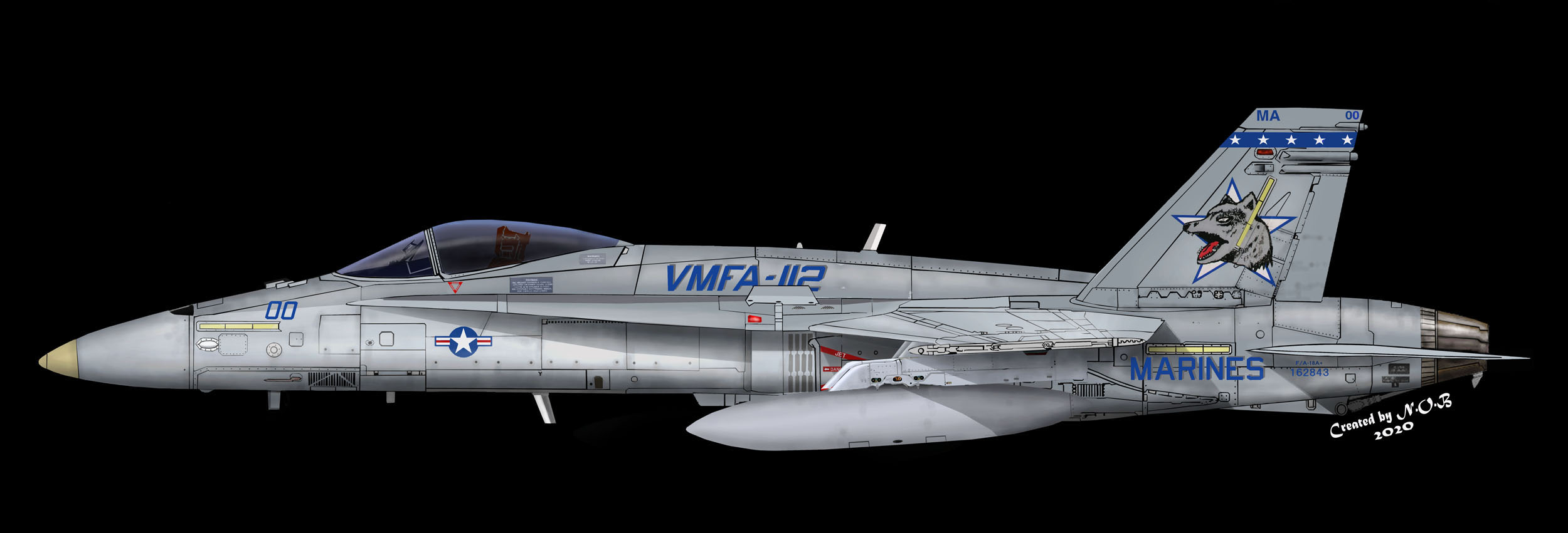 ↑2019年にデビューした新しいデザインのMA-01。過去最高の派手さを誇るマーキングで 背中に黒いラインを入れ 星が4つ並んでいる。尾翼のオオカミの顔は、ACLの所が目になっており スターターが「ON」になれば目が光るという凝った塗装である。VMFA-112 MA-01 Fa-18A++ Bu.No.162848