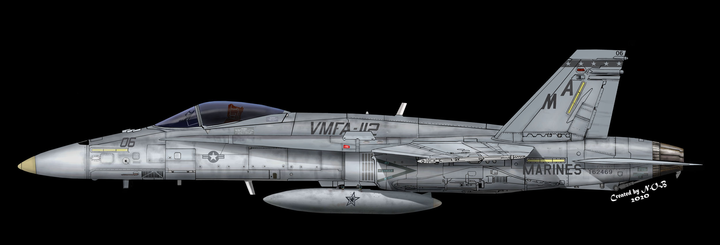 ↑このマーキングが施された時期は2006年頃であるが、幾つかのパターンに書き換えられている。センタータンクには”COWBOYS"の部隊ネームを入れ込んでいる。ジェットインテークの注意書きは、この後も赤で統一された。VMFA-112 MA-00 FA-18A+ Bu,No,162843