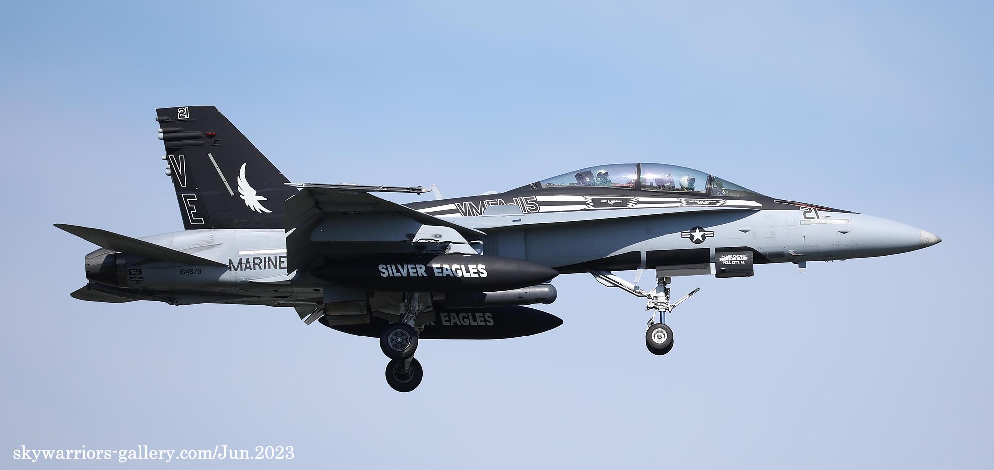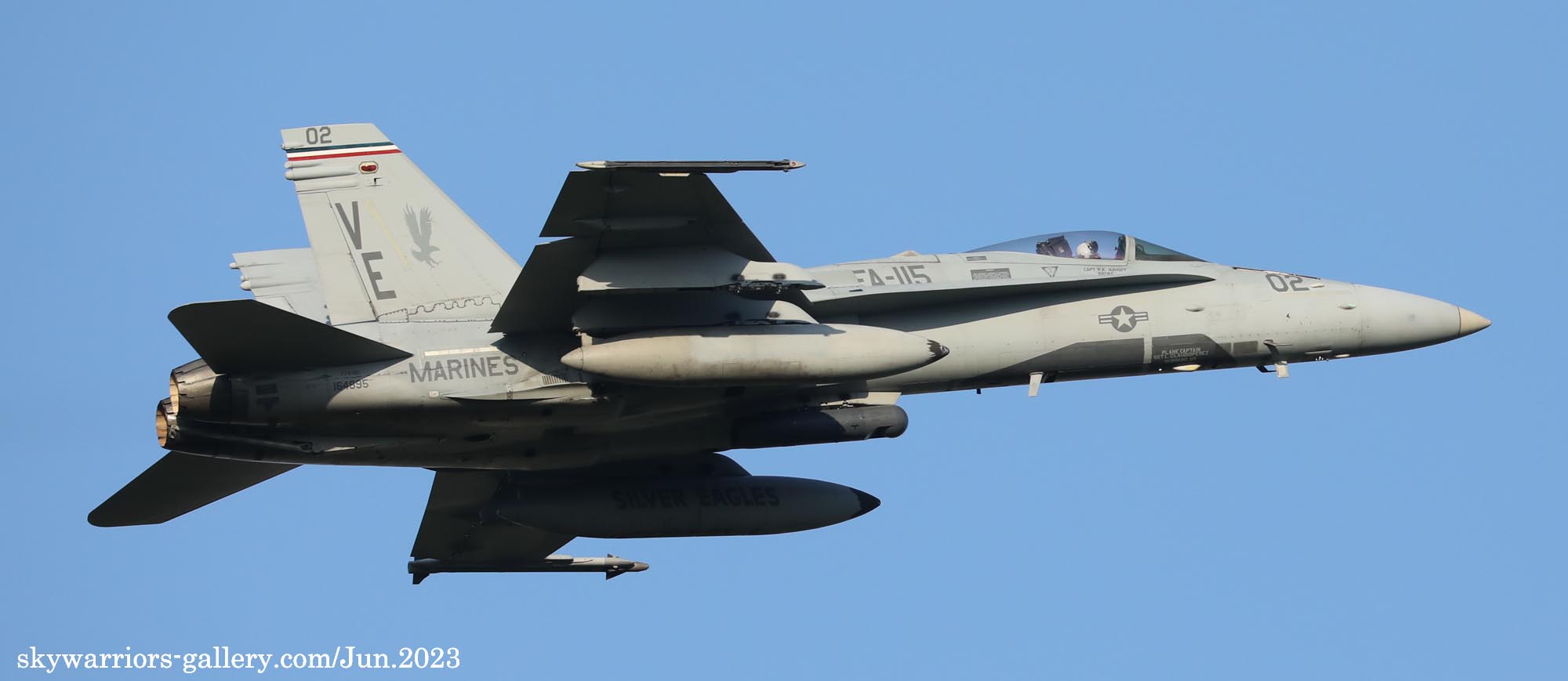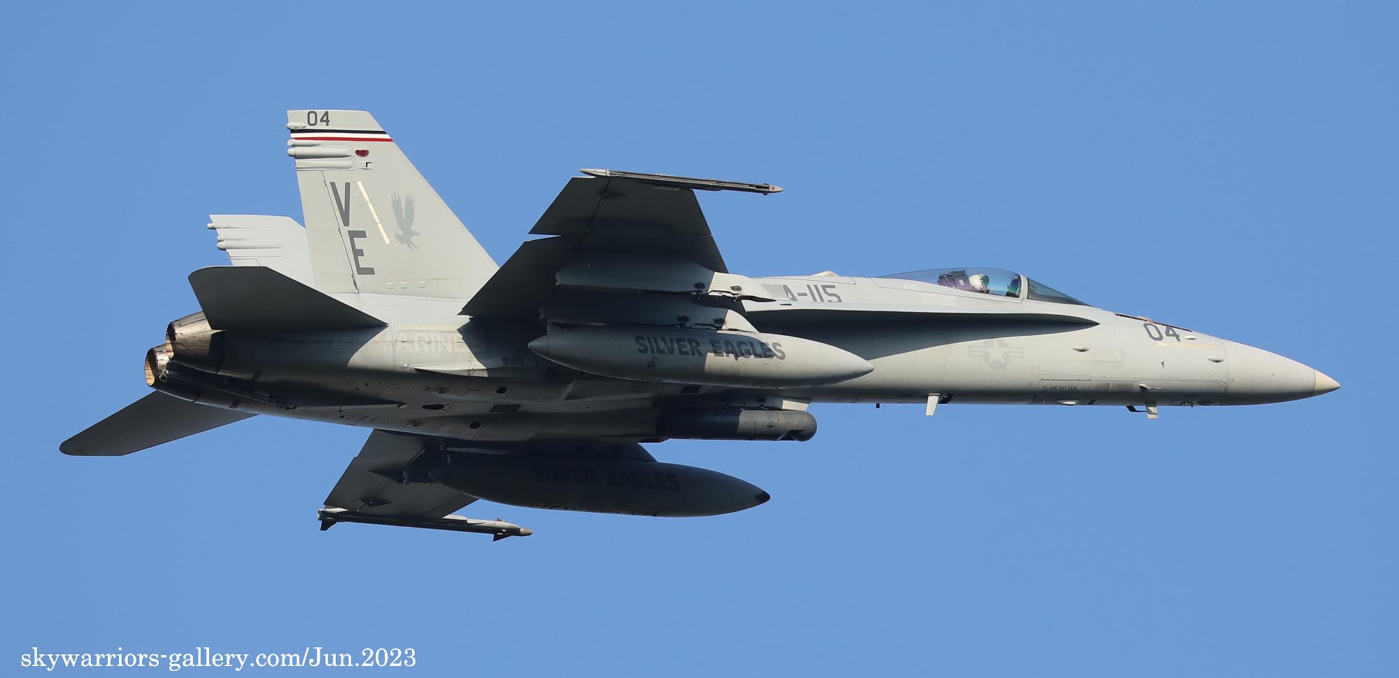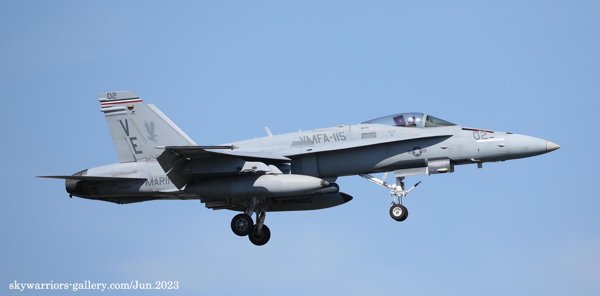 2023年6月15日 海軍厚木基地に再びVMFA-115のFA-18C/D 4機が飛来した。内2機は、VE-01とBlack-Bettyと呼ばれるVE-21である。Black-Bettyは岩国基地祭で撮ってはいるものの、厚木でフライトが撮れるのはまた一味も二味も違う、午前中仕事だったが、午後は厚木に向かう事とした。昨日16日もローカルフライトを何度か行っており、フニュ君の見立てでは4月の飛来時と同じパターンで2度のローカルフライトをやって夕方岩国に帰るはずだと言う。私もそれを信じて期待を膨らませた。フニュ君の見立て通り、午前午後と2度のフライトをこなしてくれたので、光線の良いR/W19での午後の着陸に間に合った。当日の厚木は多くのマニアが集まって、賑やかな様相であった。最後はR/W19での4機の離陸を捉える為、電車と徒歩で反対側へ移動、小林先輩とも逢えて、再び昔話に花が咲いたのである。(2023年6月 記)