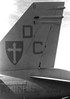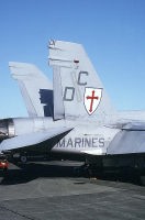 ↑ 2008年のデザイン変更に伴いDC-00は、部隊の元来のインシグニアを尾翼に描いた。酒瓶に乗った酔っぱらいの狼君である。尾翼内側はノーマーキングである。 VMFA-122 F/A-18C Bu.No.164247