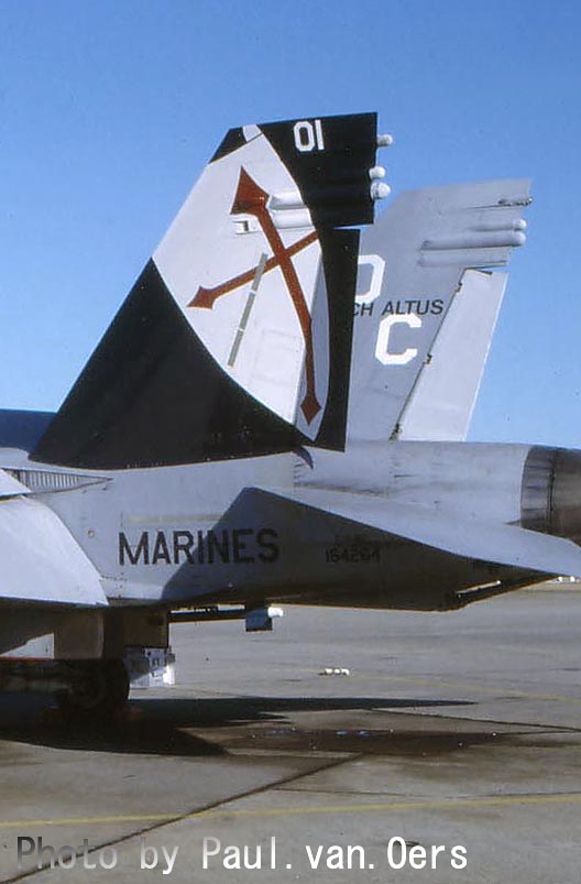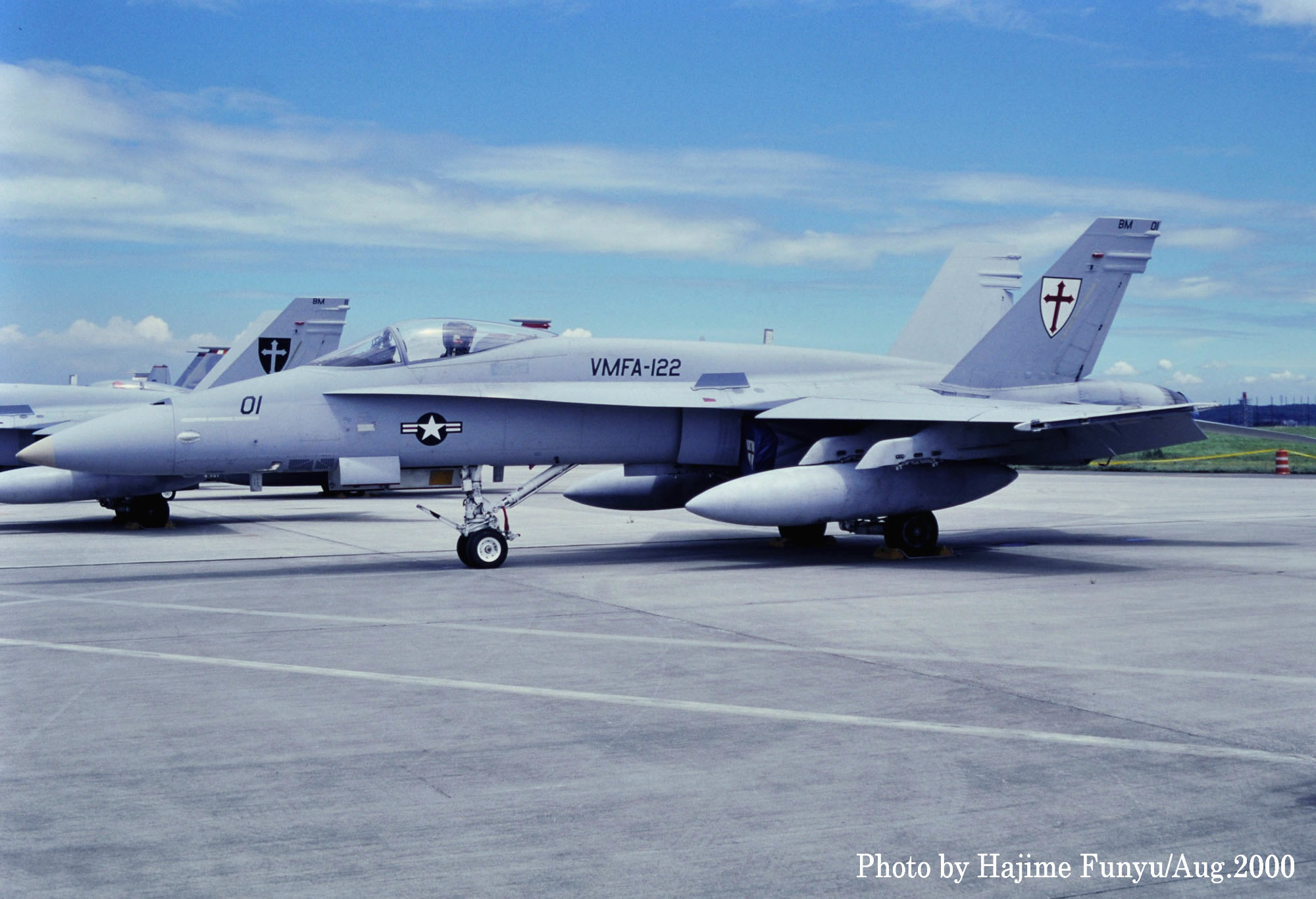 ↑2000年横田基地に展示されたVMFA-122/DC-01。一時的にVMFA-122のテールレター”DC”が無い?時期があった。しかし 01以外の他の機体も十字軍の盾は黒で書き込まれており、ロービジ全盛期にあって比較的目立つマーキングだったのだ。