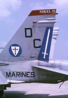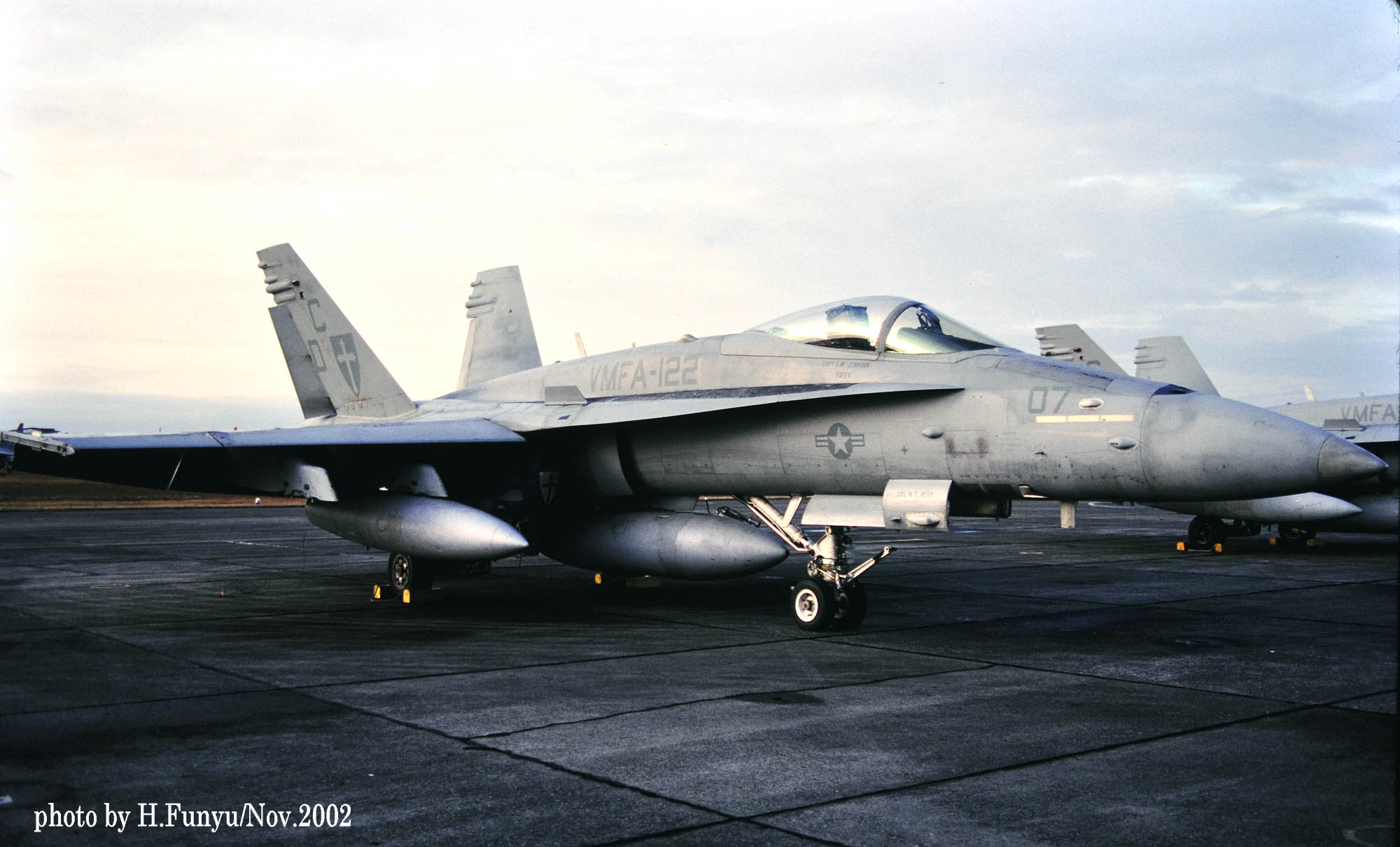 ←2002年横田基地OHに展示されたVMFA-122のFA-18Cの2機。DC-01は、クルセーダーからF-4B/J時代を彷彿させるマーキングで 久々にセンスも良く、またマニアを喜ばせるに充分なデザインである。