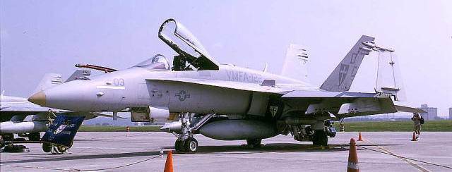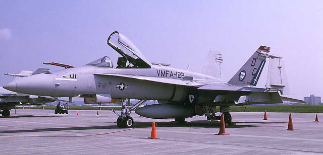 ↑ 2002年横田公開で展示されたDC-01に引き続き、2004年はより派手になって、ついに十字軍盾が尾翼全体に描かれるようになり このVMFA-122の司令官指定機の塗装は、この後の部隊マーキングに大きな影響を与えた。VMFA-122 F/A-18C Bu.No.164264